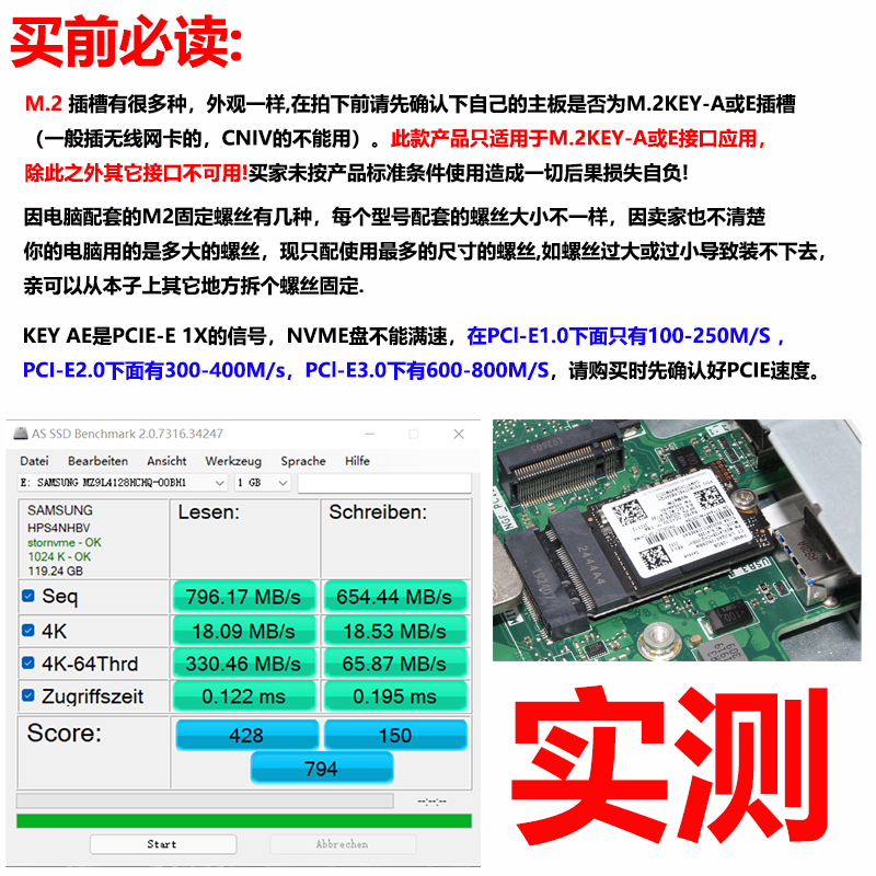 3.KEY AE is the signal of PCIE - E 1X. The NVME drive cannot run at full speed. Under PCI - E1.0, it is only 100 - 250M/S. Under PCI - E2.0, it is 300 - 400M/s. Under PCI - E3.0, it is 600 - 800M/S. Please confirm the PCIE speed before purchasing.