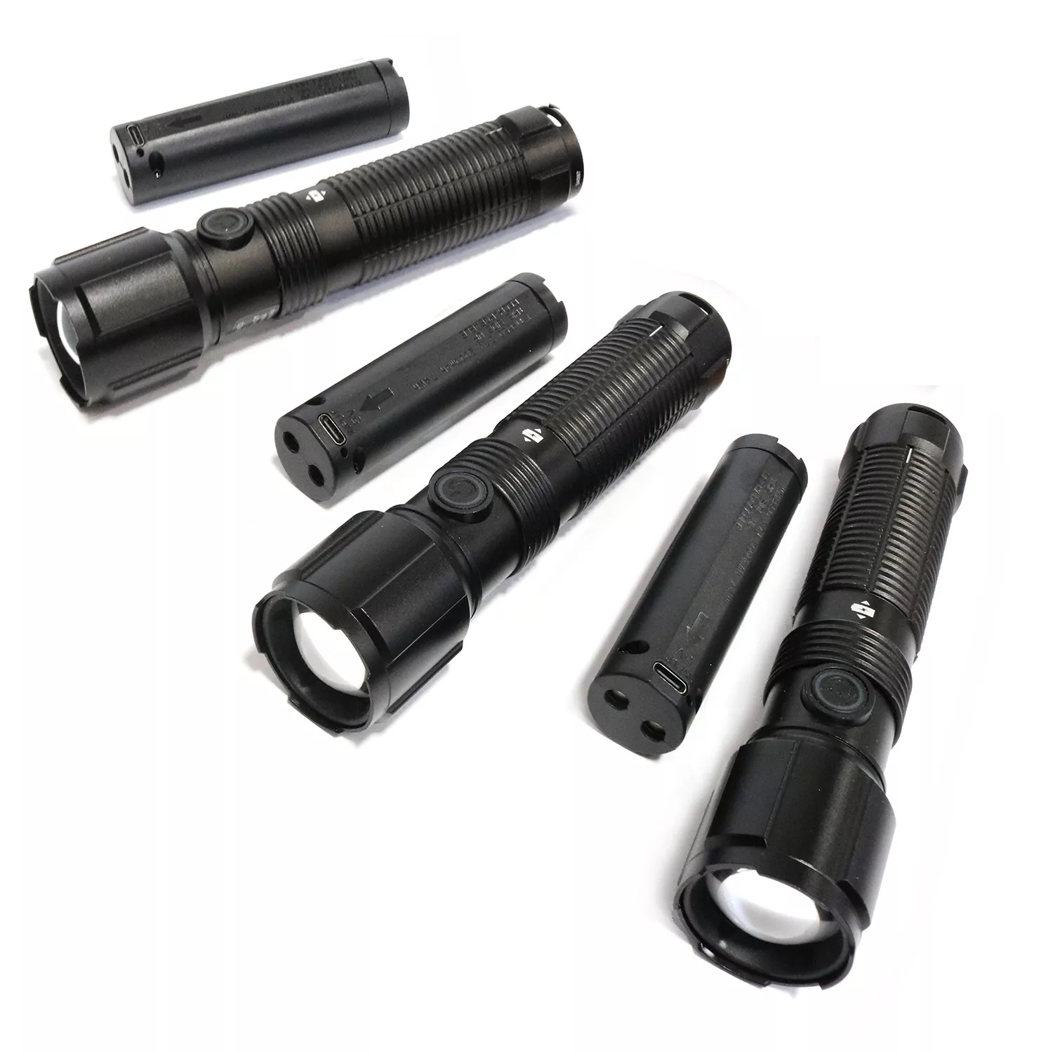 - Optimized LED technology provides a maximum 1700 lumens of brightness and up to 45 hours run time - Illuminated on/off switch controls 5 light modes, plus safety lock-out - Durable heat treated anodized aluminum body that meets or exceeds ANSI FL1 specs and IPX4 standards for impact and water resistance - End-cap eyelets for lanyard, key ring or carabiner - Includes 3 rechargeable Lithium Ion batteries, 3 alkaline battery adaptors, twelve AAA batteries, and 3 USB-A to C charge cords