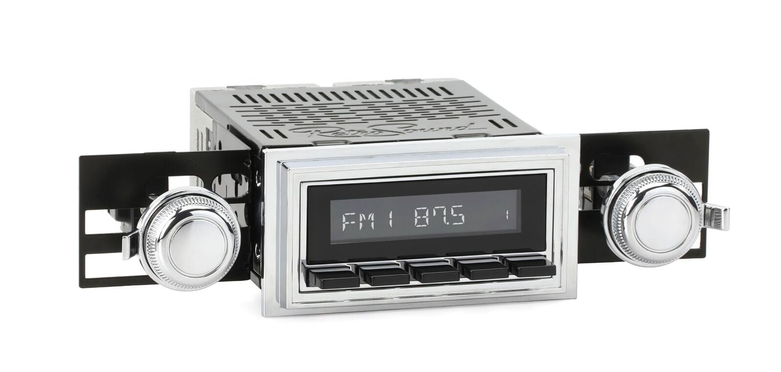 The RetroSound® RetroRadio® is our most versatile Radio Face, designed after traditional 2-shaft radios with classic push-buttons found in thousands of makes & models from the 40s-80s. Combined with hundreds of faceplates, bezels, and replica knobs, the RetroRadio is the most authenticsolution for adding modern audio to classic cars and trucks. The RetroRadio is available in black or chrome, with the choice of black, chrome, or ivory push-buttons.