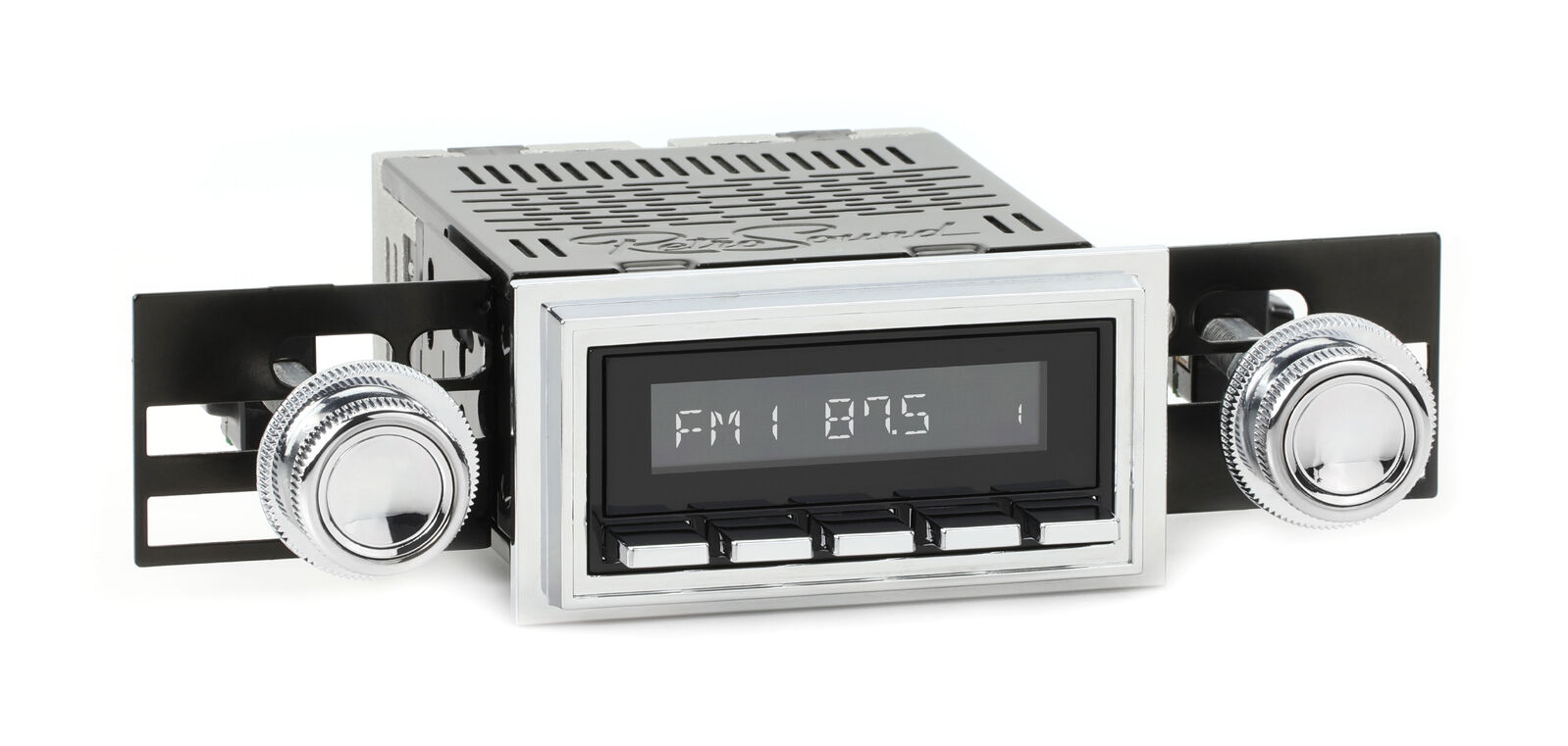 The RetroSound® Redondo-RT radio replicates factory radios in vintage 60s-70s Mopar vehicles that had thumb-roller controls. The radios display, thumb-rollers, and push-button assemblies can be adjusted independently during installation to achieve a factory-like fit.