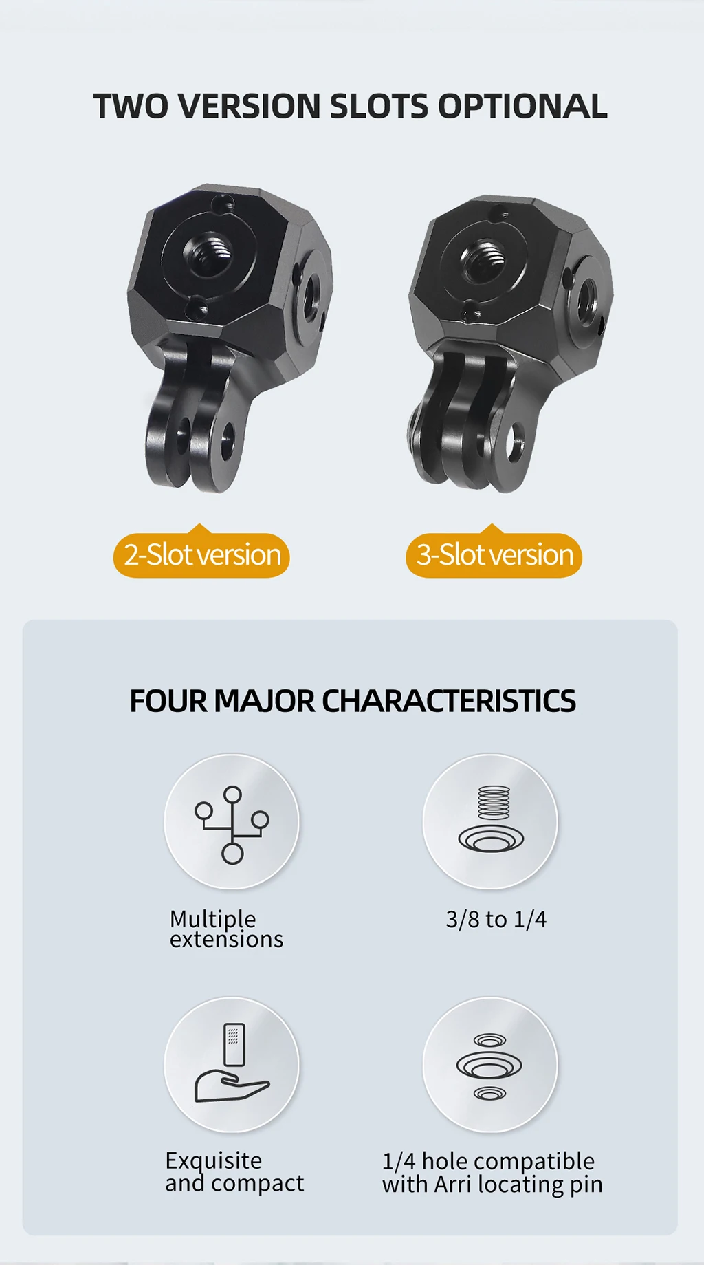 There are screw holes on all sides of the product, 1/4" ARRI Locating Screw Holes and 3/8" ARRI Locating Screw Holes, which can expand the corresponding accessories and prevent the fitting from reversing;