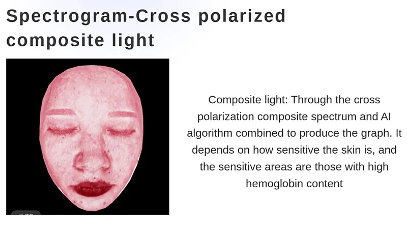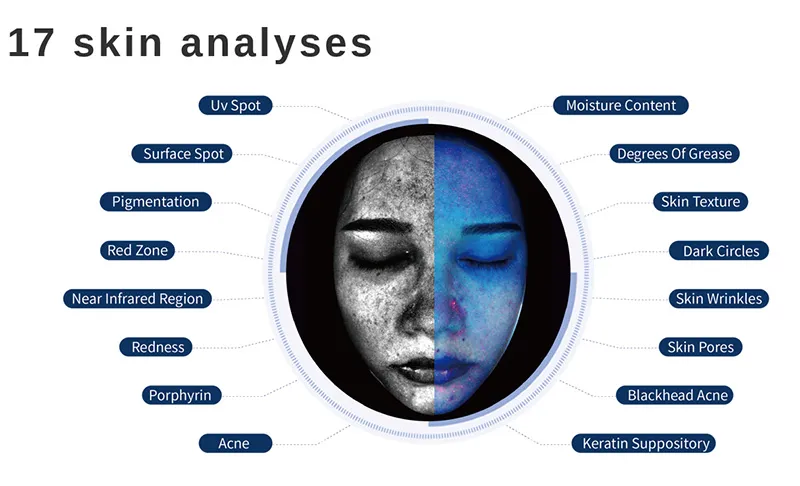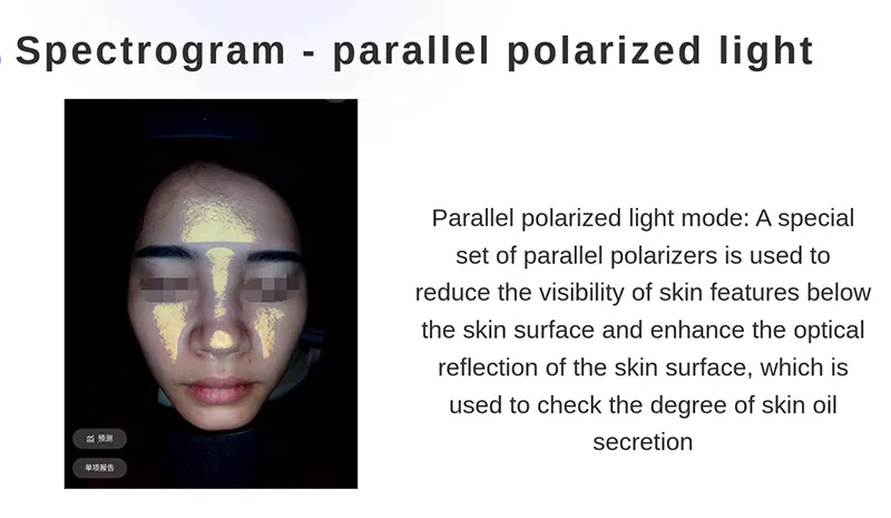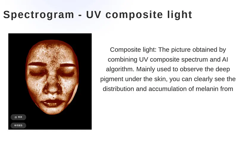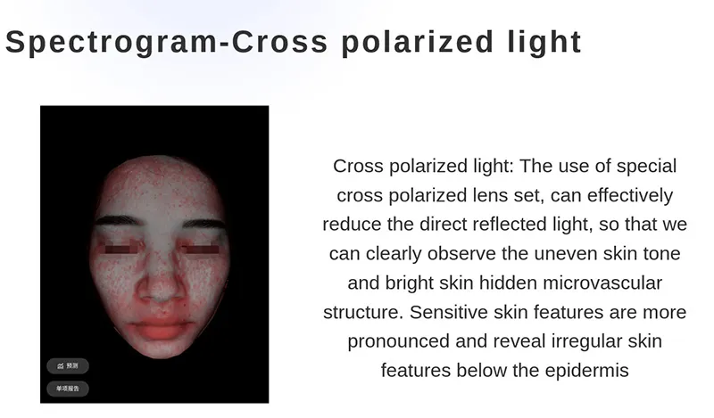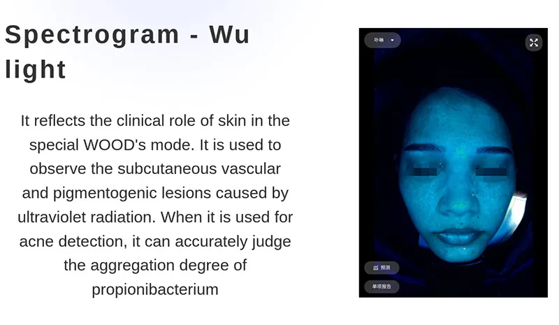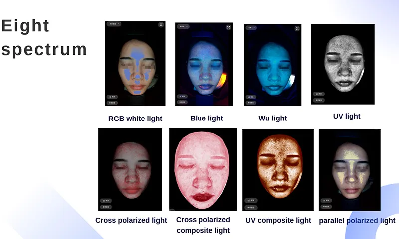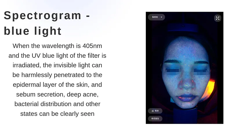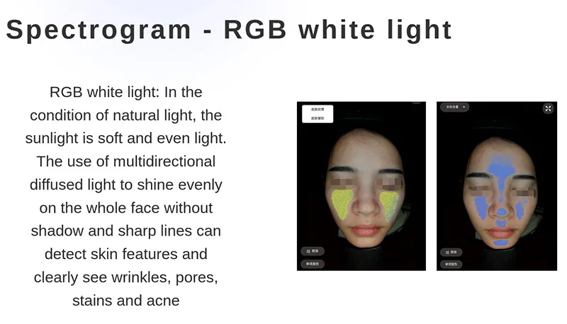 Lens imported from Japan which has 30 million HD pixels to obtain facial skin image, 8 Ilmaging Spectrometry, AI face Recognition Ilmaging Spectrometry, AI face Recognition technology. It's data analysis and detection, 3D skin simulation technology, cloud computing cloud storage, Quantitative analysis of surface and deep pathological features of the skin, detecting 16 kind of skin health indicators