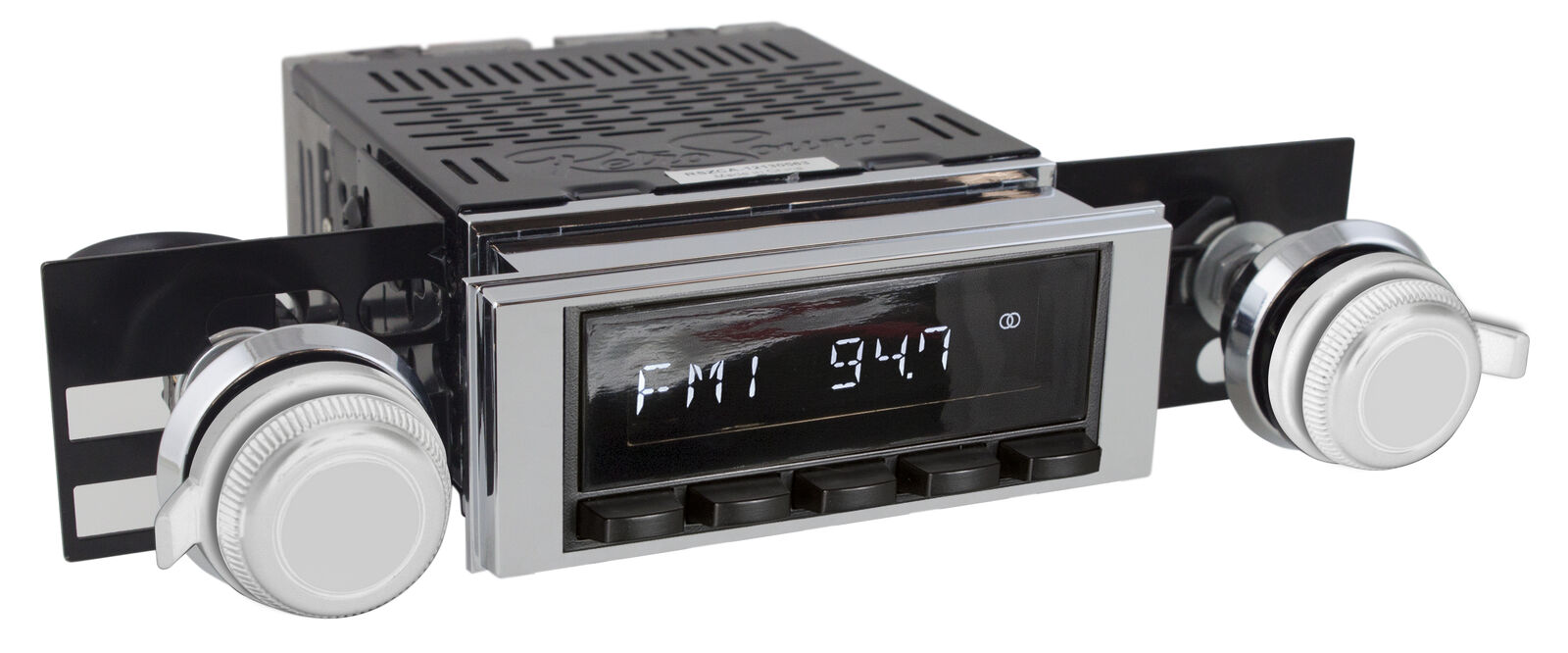 The RetroSound® RetroRadio® is our most versatile Radio Face, designed after traditional 2-shaft radios with classic push-buttons found in thousands of makes & models from the 40s-80s. Combined with hundreds of faceplates, bezels, and replica knobs, the RetroRadio is the most authentic solution for adding modern audio to classic cars and trucks. The RetroRadio is available in black or chrome, with the choice of black, chrome, or ivory push-buttons.