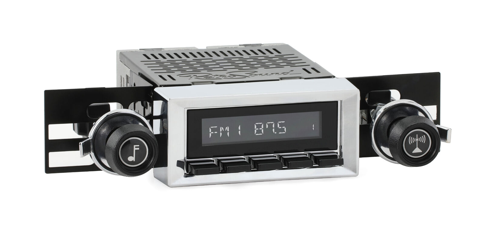 The RetroSound® RetroRadio® is our most versatile Radio Face, designed after traditional 2-shaft radios with classic push-buttons found in thousands of makes & models from the 40s-80s. Combined with hundreds of faceplates, bezels, and replica knobs, the RetroRadio is the most authentic solution for adding modern audio to classic cars and trucks. The RetroRadio is available in black or chrome, with the choice of black, chrome, or ivory push-buttons.