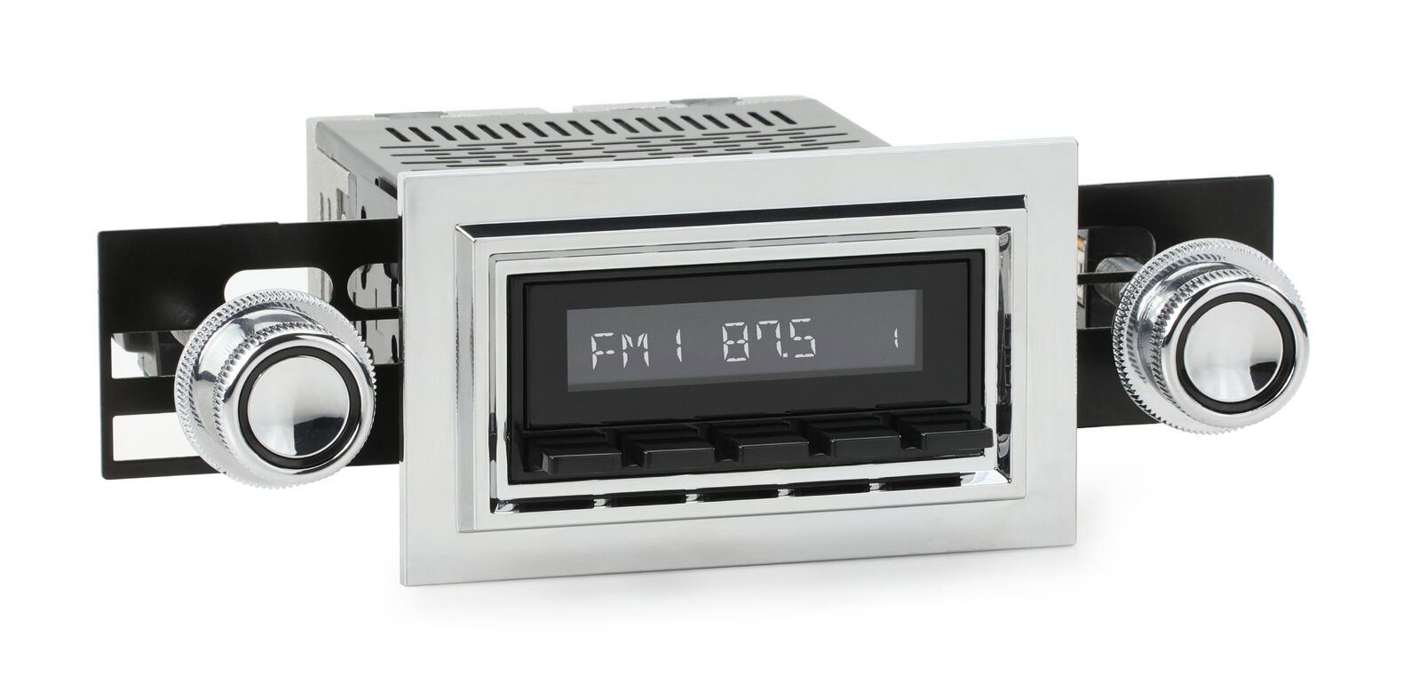 The RetroSound® RetroRadio® is our most versatile Radio Face, designed after traditional 2-shaft radios with classic push-buttons found in thousands of makes & models from the 40s-80s. Combined with hundreds of faceplates, bezels, and replica knobs, the RetroRadio is the most authentic solution for adding modern audio to classic cars and trucks. The RetroRadio is available in black or chrome, with the choice of black, chrome, or ivory push-buttons.