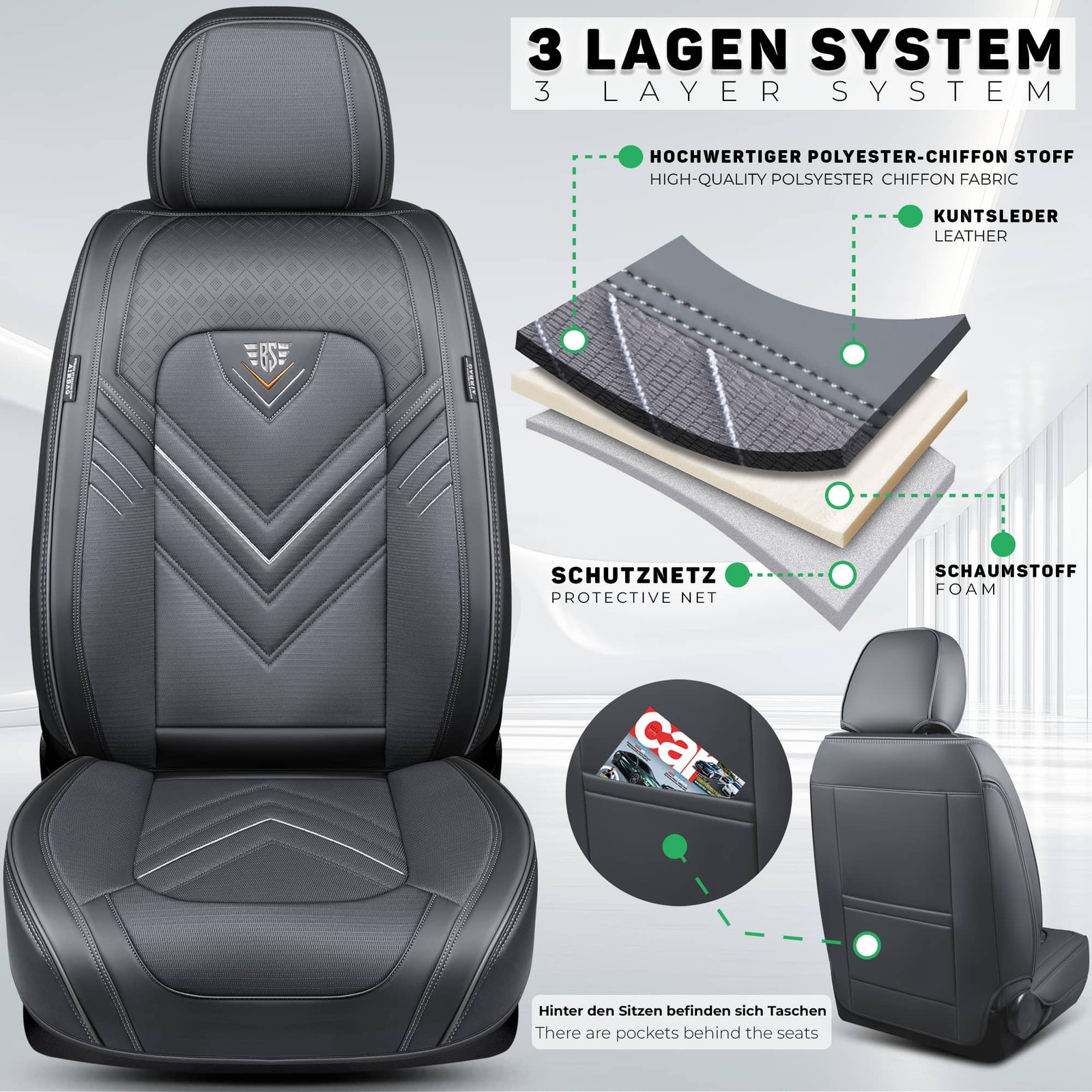 Machen Sie Ihr Fahrzeug komfortabler und langlebiger mit diesen praktischen und eleganten Schonbezügen! Schützen Sie Ihre Sitze und verleihen Sie Ihrem Auto gleichzeitig ein neues, hochwertiges Aussehen.