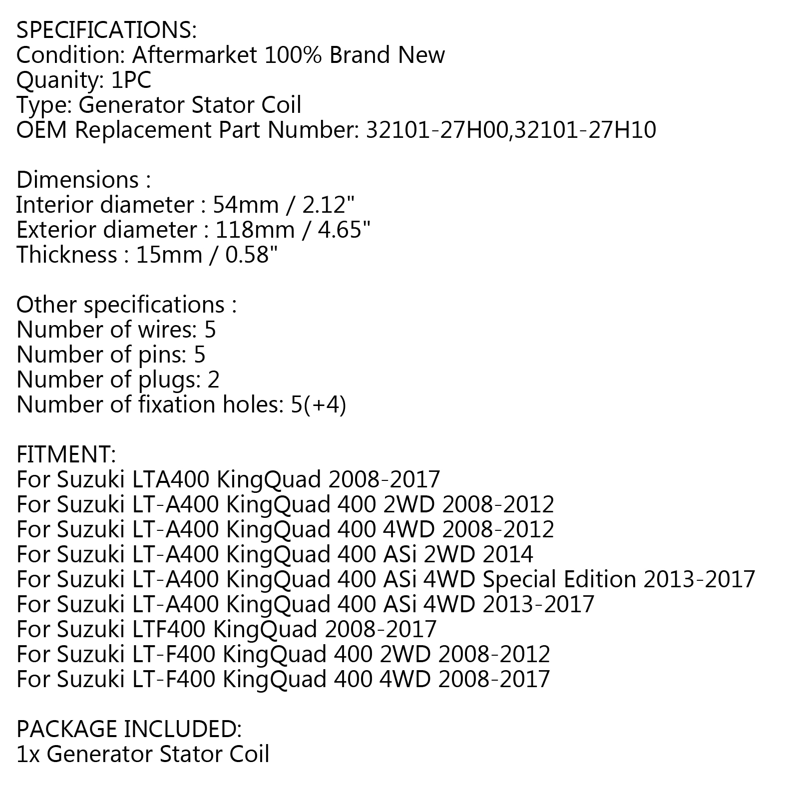 Magneto Generator Engine Stator Coil For Suzuki LTA400 LT-A400 LTF400 LT-F400 KingQuad 400 2008-2017