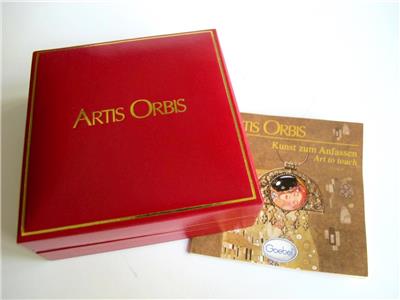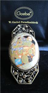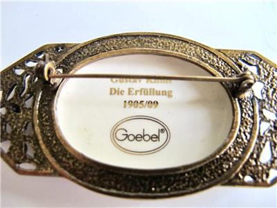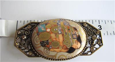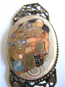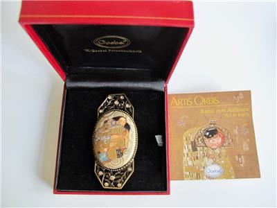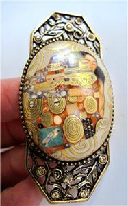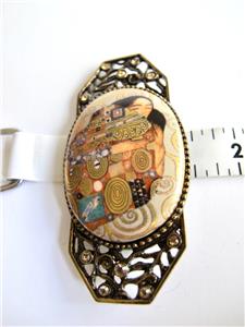 This is a reproduction in enamel of "The Kiss" set in gold tone metal in which crystals are set into the top and bottom of the structure.