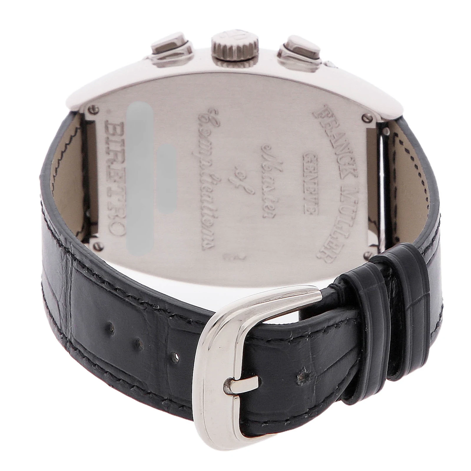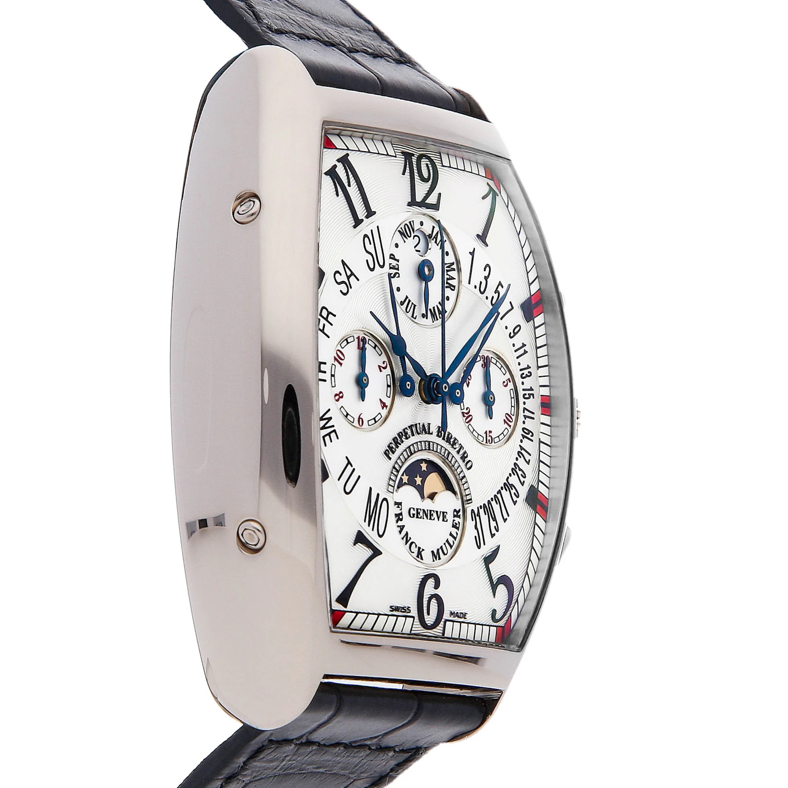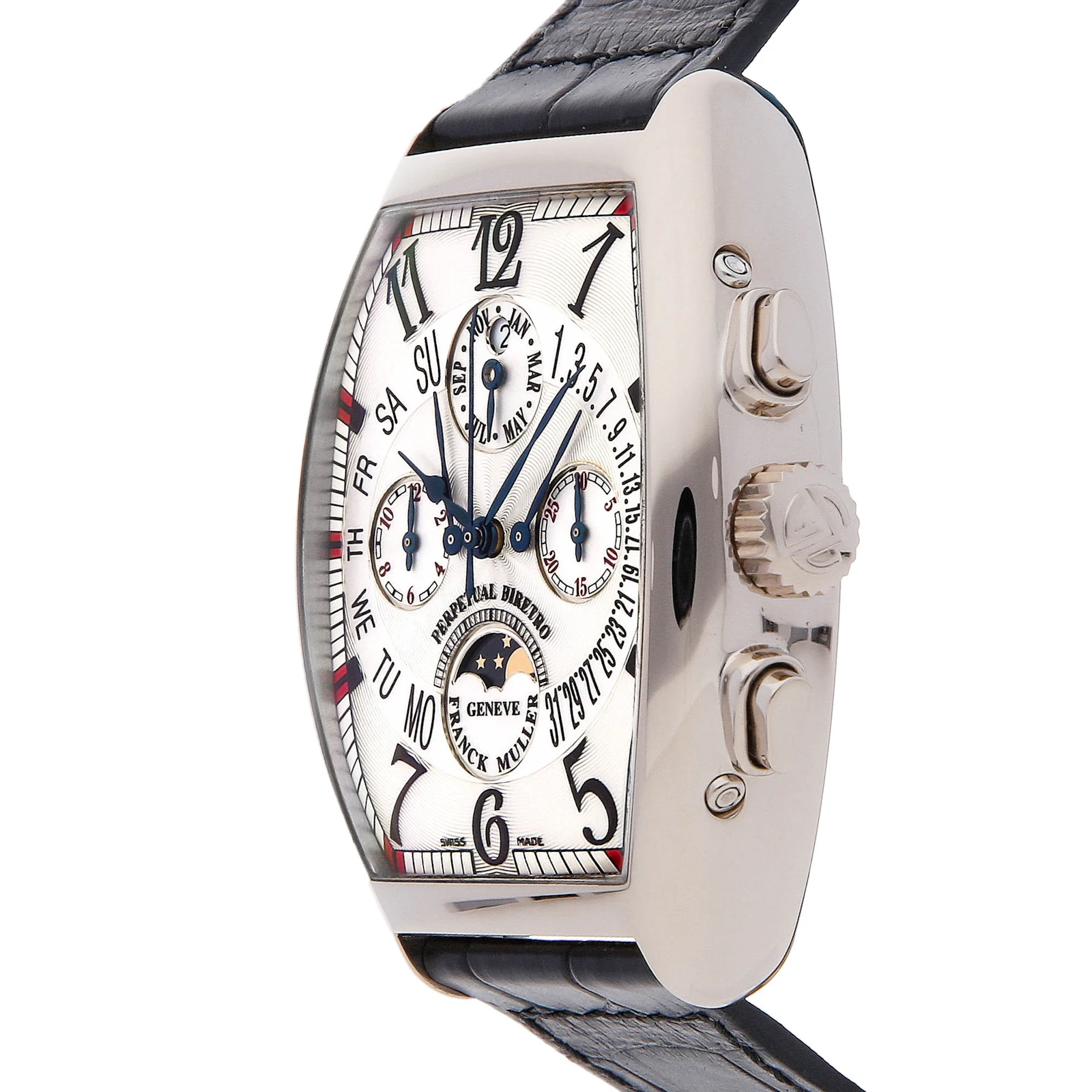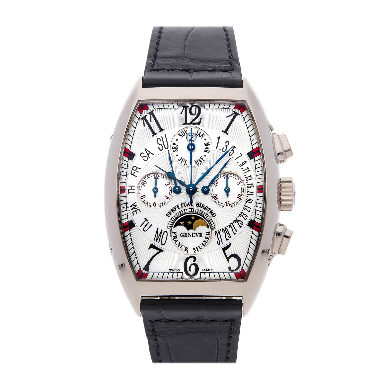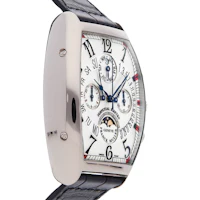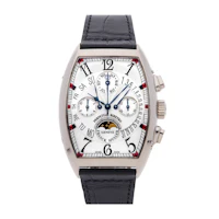 Pre-Owned Franck Muller Curvex Quantieme Perpetual Calendar Bi-Retro (7850CCQPBBIRETRO) self - winding automatic watch, features a 36mm x 42mm 18k white gold case surrounding a silver dial on a black Jean Rousseau leather strap with an 18k white gold tang buckle. Functions include hours, minutes, small seconds, chronograph, retrograde date, retrograde day, month, moon phase and perpetual calendar. This watch comes with box and papers. We back this watch with The 1916 Company 2-Year warranty!