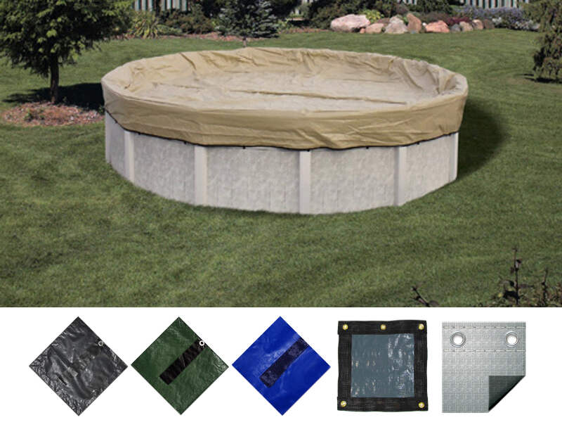 20' / 21' Round Above Ground Swimming Pool Tarp Winter Cover For your shopping convenience, we've combined all manufacturers and materials of our 20' / 21' round pool covers on one page! Compare and choose your preferred brand and material from the drop-down menu above! Note: our winter pool covers feature 4' of overlap material allowing for proper overlap of the pool top seat. Actual measurement for 20' / 21' round pool covers will be approximately 24' / 25' diameter. Covers are held strong and secure with the included heavy duty cable and winch system Winter cover seals pool to minimize spring maintenance! UV Protection to protect cover fading from sunlight Dark underside to prevent algae growth Available in your choice of materials below Replacing your old, worn out winter cover protects your pool investment and keeps your back yard looking sharp during the winter months! Choose your material grade from the drop-down menu above HPI Armor Kote Tan - MADE IN THE USA, our strongest and most durable cover features a 20-year Manufacturer's Warranty, 5-year full Warranty GLI Estate Plus Xtreme Gray with 20-year Manufacturer's Warranty, 3-year full Warranty Swimline SuperGuard Blue with 10-year Manufacture’s Warranty, 1-year full warranty - 8x8 scrim count Swimline SilverGuard with 15-year Manufacture’s Warranty, 2-year full warranty - 12x12 scrim count Swimline RipStopper Green with 15-year Manufacturer's Warranty, 2-year full warranty - Complete rip-proof patented technology with advanced manufacturing yields 3x normal tear strength. Swimline Leaf Net Black with 8-Year Manufacture’s Warranty, 1-year full Warranty Arctic Armor Graphite, 10-Year Manufacture’s Warranty, 2-year full Warranty - 9x9 scrim count Arctic Armor Dark Green, 12-Year Manufacture’s Warranty, 2-year full Warranty - 10x10 scrim count Arctic Armor Royal Blue, 15-Year Manufacture’s Warranty, 3-year full Warranty - 14x14 scrim count Arctic Armor Rugged Mesh Black with 8-year Manufacture’s Warranty, 1-year full Warranty Arctic Armor Leaf Net Black with 4-year Manufacture’s Warranty, 1-year full Warranty