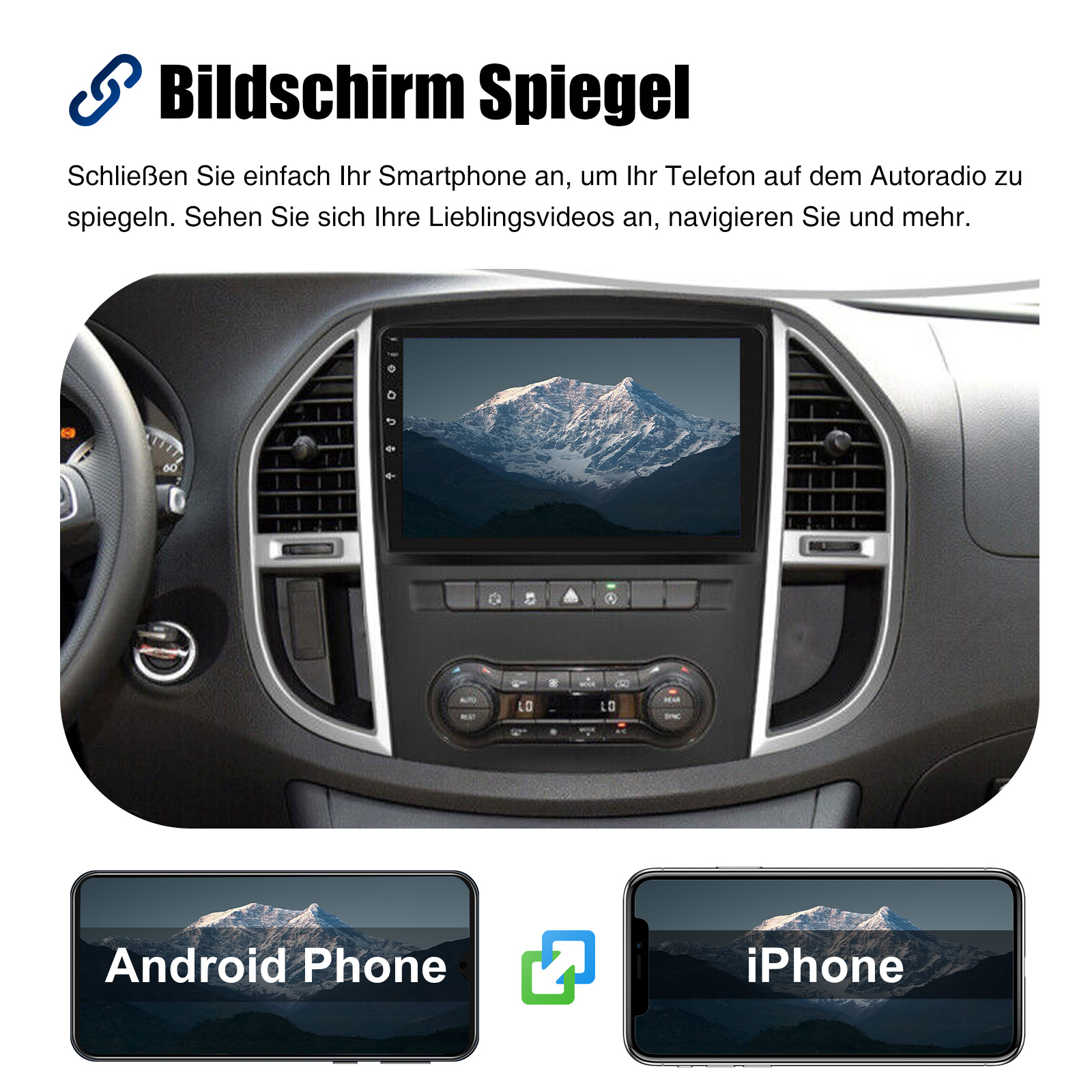 Bildschirm Spiegelfür iOS/Android: Das Autoradio unterstützt Mirror Link für iOS/Android-Telefone. Nachdem Sie das Radio angeschlossen haben, können Sie die Telefonseite mit dem 10-Zoll-Touchscreen des Radios synchronisieren. Das iPhone stellt eine Verbindung über WLAN her, und das Android-Telefon stellt eine Verbindung über WLAN oder das Original-USB-Kabel her (gilt nicht für Samsung- und Huawei-Telefone).