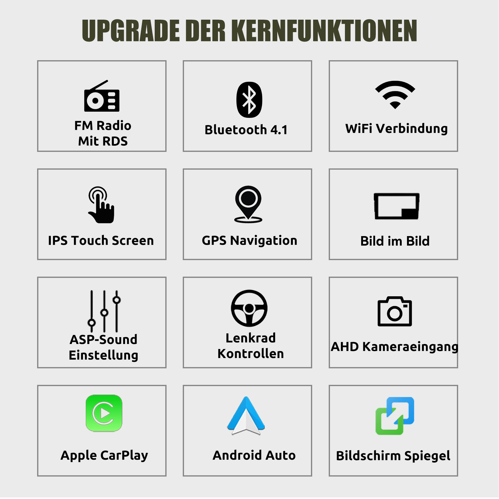 Wireless Carplay und Android Auto: Tauchen Sie ein in ein nahtloses und benutzerfreundliches Infotainment-Erlebnis mit Apple CarPlay & Android Auto. Verbinden Sie Ihr iPhone mit Apple CarPlay oder Ihr Android-Smartphone mit Android Auto und greifen Sie sicher auf Anrufe, Textnachrichten, Navigation, Musik und vieles mehr zu. Mit intuitiver Bedienung über den Touchscreen oder Sprachsteuerung haben Sie alle Funktionen bequem zur Hand, während Sie sicher am Steuer bleiben. Nutzen Sie Ihre bevorzugten Apps und bleiben Sie jederzeit verbunden, während Sie den Blick auf die Straße gerichtet haben. Machen Sie Ihr Fahrzeug zu einem erweiterten Hub für Ihre mobilen Geräte und erleben Sie eine neue Dimension des Infotainments.