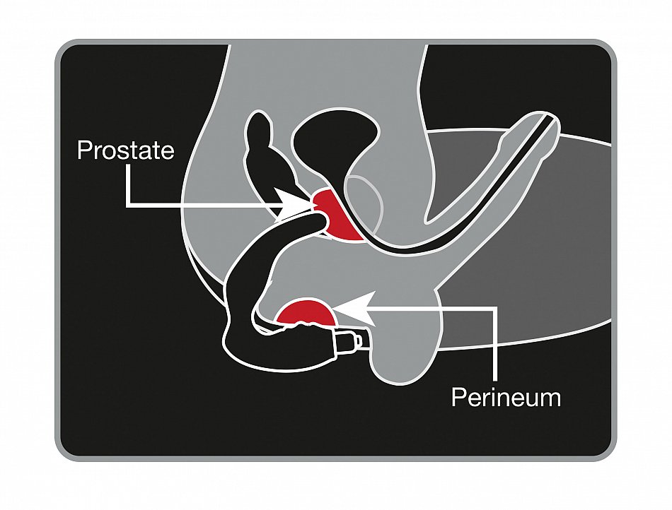 Schwarzer Analvibrator zur gleichzeitigen Stimulation von Prostata und Perineum. Sieben Vibrationsstufen per Knopfdruck regelbar. Vibrator zur Reinigung herausnehmbar. Ø 1 bis 4 cm. Material: Silikon. Inklusive Batterie