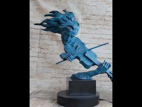 Immerse yourself in the captivating world of music and art with this mesmerizing bronze sculpture. The graceful figure of a woman comes to life as her hair flows in the wind, and she becomes one with the enchanting sound of her violin. With eyes closed and a sense of tranquility, she skillfully draws her bow across the strings, creating sweet melodies that resonate in harmony with her soul.This unique and intricate piece showcases the artist's remarkable craftsmanship. With only one arm mounted to the base, the sculpture is meticulously held together, piece by piece, accentuating the artist's attention to detail. The violin, adorned with marks from the artist's tools, is delicately portrayed, and the woman's fingers gently press down on the strings, bringing the instrument to life. The other hand and bow gracefully complement the composition, while her expressive face and lips add a touch of realism to this masterpiece.Handmade using the time-honored ""Lost Wax Method,"" this 100% bronze sculpture features a Green patina finish, lending it a timeless allure. Signed by the renowned artist Milo, this magnificent piece is perfect for both music lovers and art enthusiasts alike. Let the beauty and eccentricity of this sculpture captivate your senses and make it a cherished addition to your collection or an unforgettable gift for someone special.