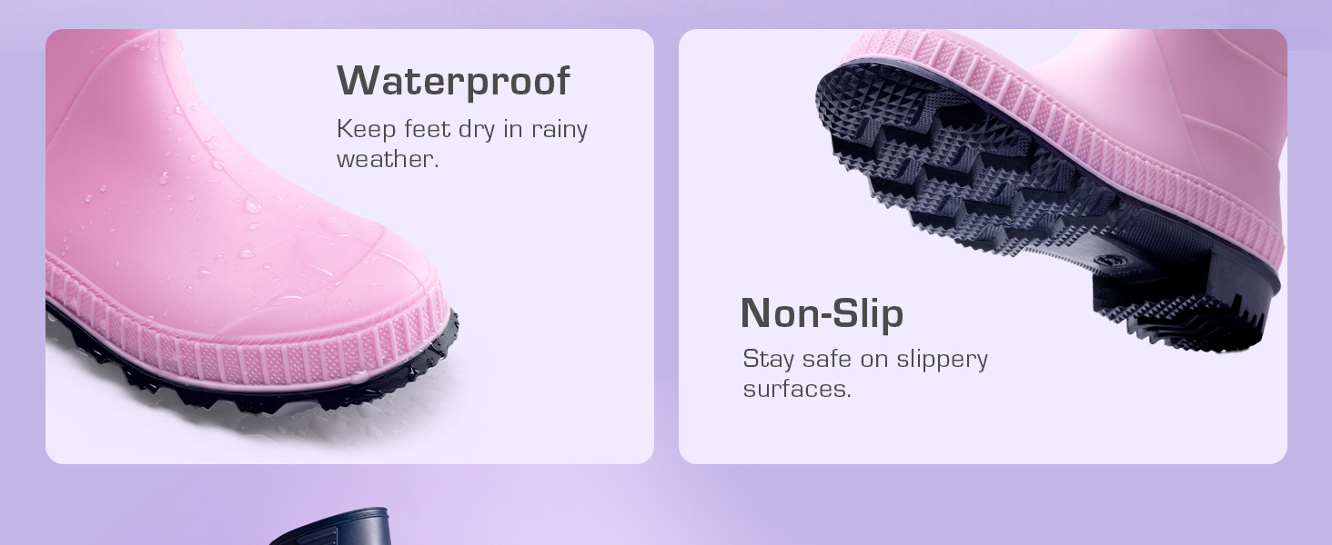 • Say Goodbye to Slips: Stay steady every step of the way with these kids' rain boots. These outdoor rain boots are designed with textured patterns on the outsole, keeping your child safe on slippery surfaces.