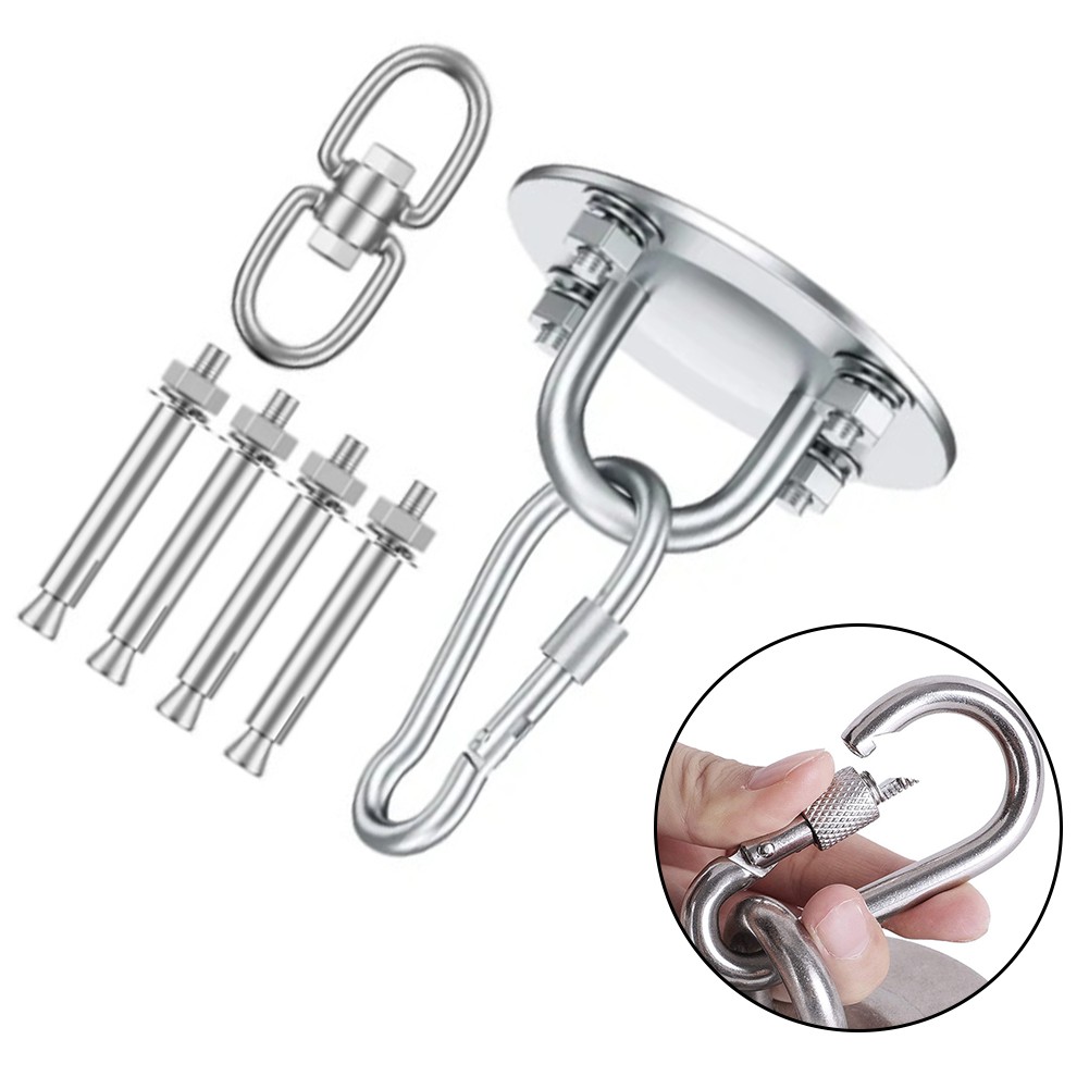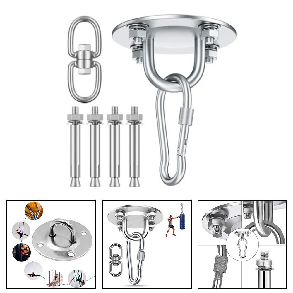 *Complete set pour sans souci installation : l'ensemble de suspension de plafond comprend tous les composants nécessaires tels la plaque, les ancrages robustes, les tubes d'expansion, le mousqueton et le joint pivotant à 360 °. Aucun accessoire supplémentaire n'est nécessaire, pour ce qui rend l'installation sans tracas.