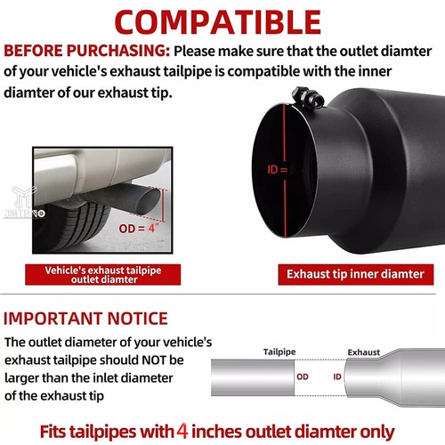 Features • Ideal for vehicles with diesel exhaust system. • Prevent the tail pipe deformation, to prevent the heat back. • Not easy to accumulate water. • Excellent resistance to corrosion and oxidation resistance. Easy to clean. • Enhance the appearance of your car. • Easy to install. Direct bolt-on without any modification. (No instruction included) (We suggest to tighten them periodically to avoid loose. Additional welding is required for secure installation.)
