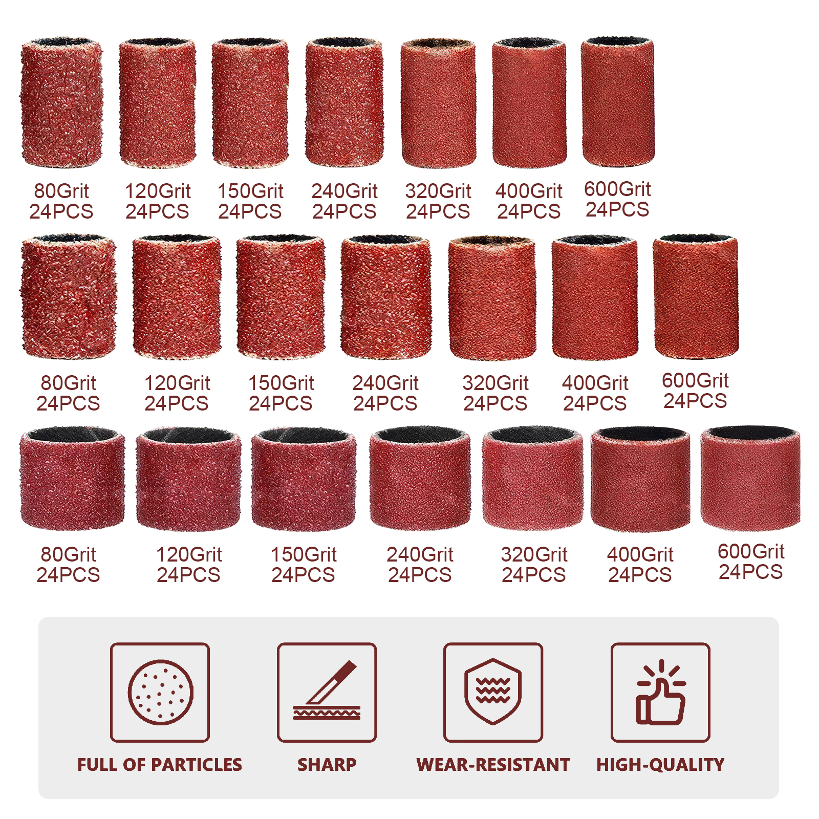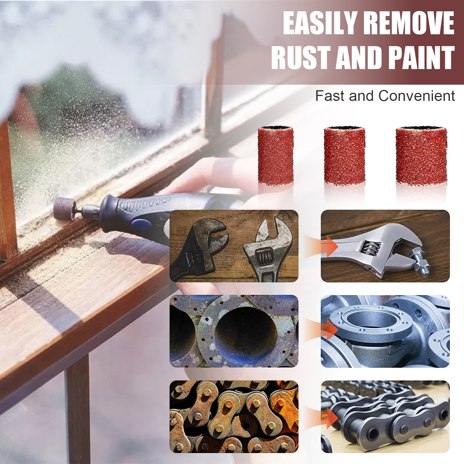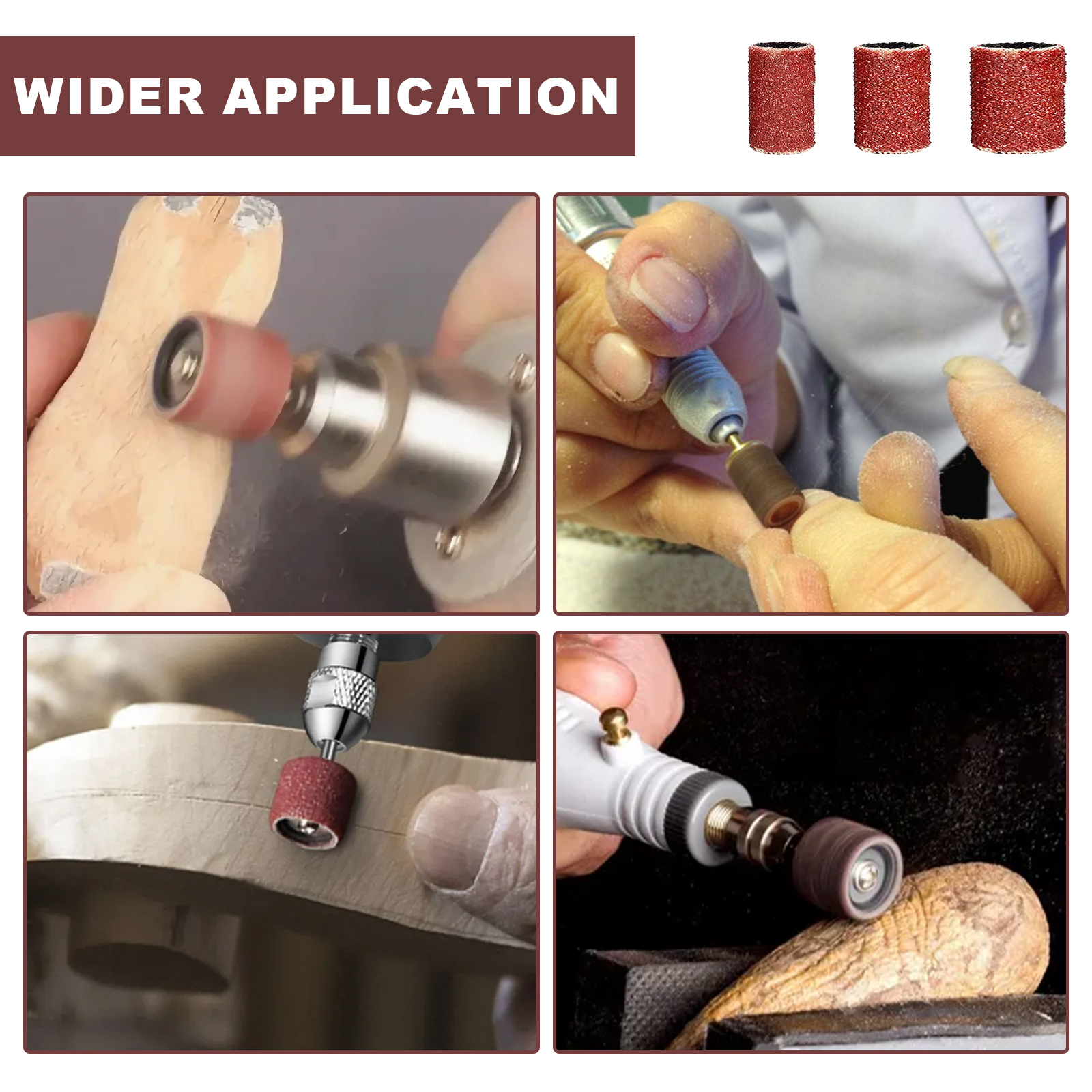 Commonest and standard size drum sander set which are widely applied in smoothing the surface and curved edges, polishing both soft and hard materials, like home improvement, artwork, woodworks, and other DIY finishing and working.