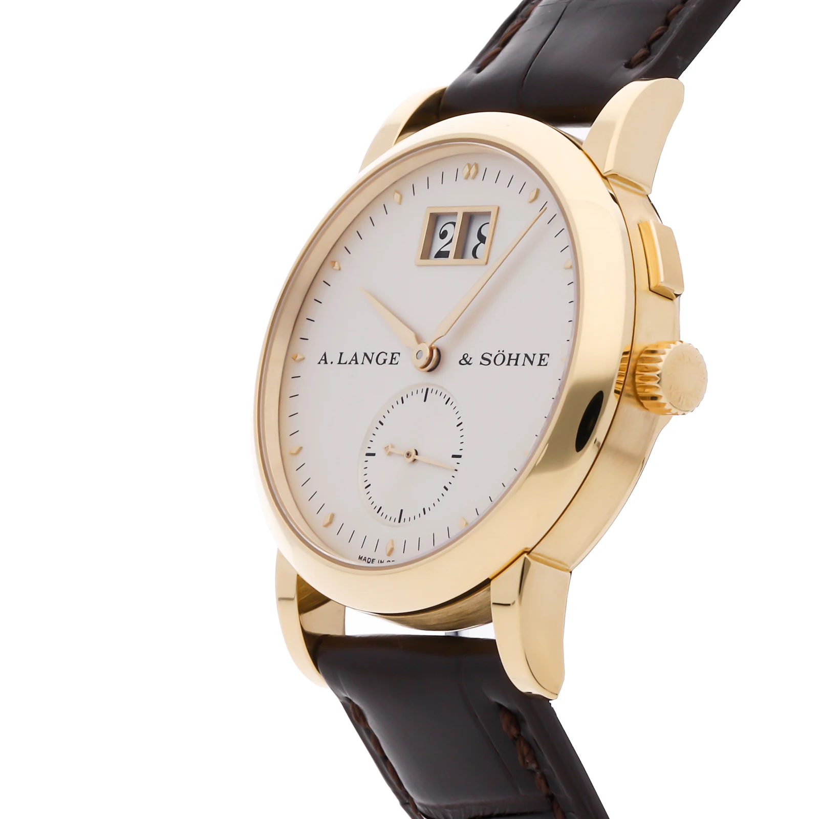 Pre-Owned A. Lange & Sohne Saxonia Outsize Date (105001) manual wind watch, features a 34mm 18k yellow gold case surrounding a light champagne dial on a dark brown leather strap with an 18k yellow gold tang buckle. Functions include hours, minutes small seconds and date. This watch comes complete with the original box and papers. We back this watch with a 2-Year warranty by The 1916 Company!