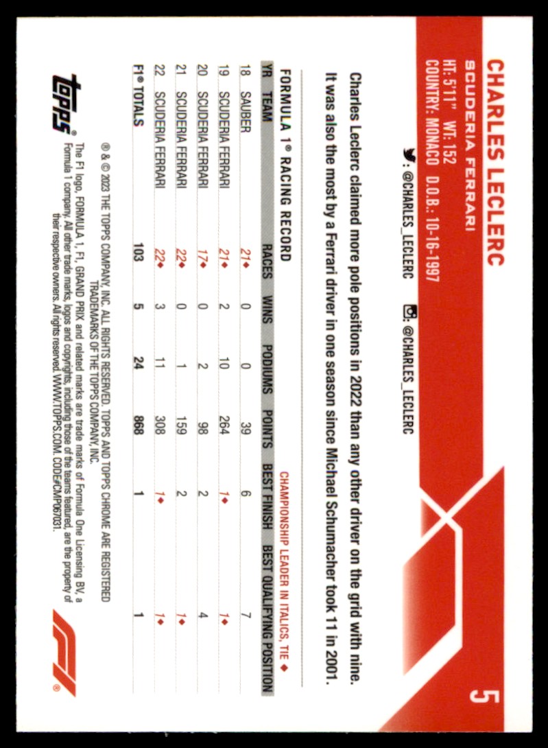 | 2023 Topps Chrome Formula 1 Checkered Charles Leclerc #5 Scuderia Ferrari | ||||||||||||||||