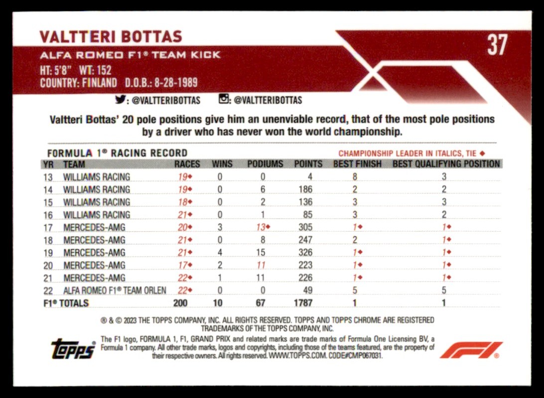 | 2023 Topps Chrome Formula 1 Fuchsia Lava Valtteri Bottas 064/250 #37 Alfa Romeo | ||||||||||||||||||