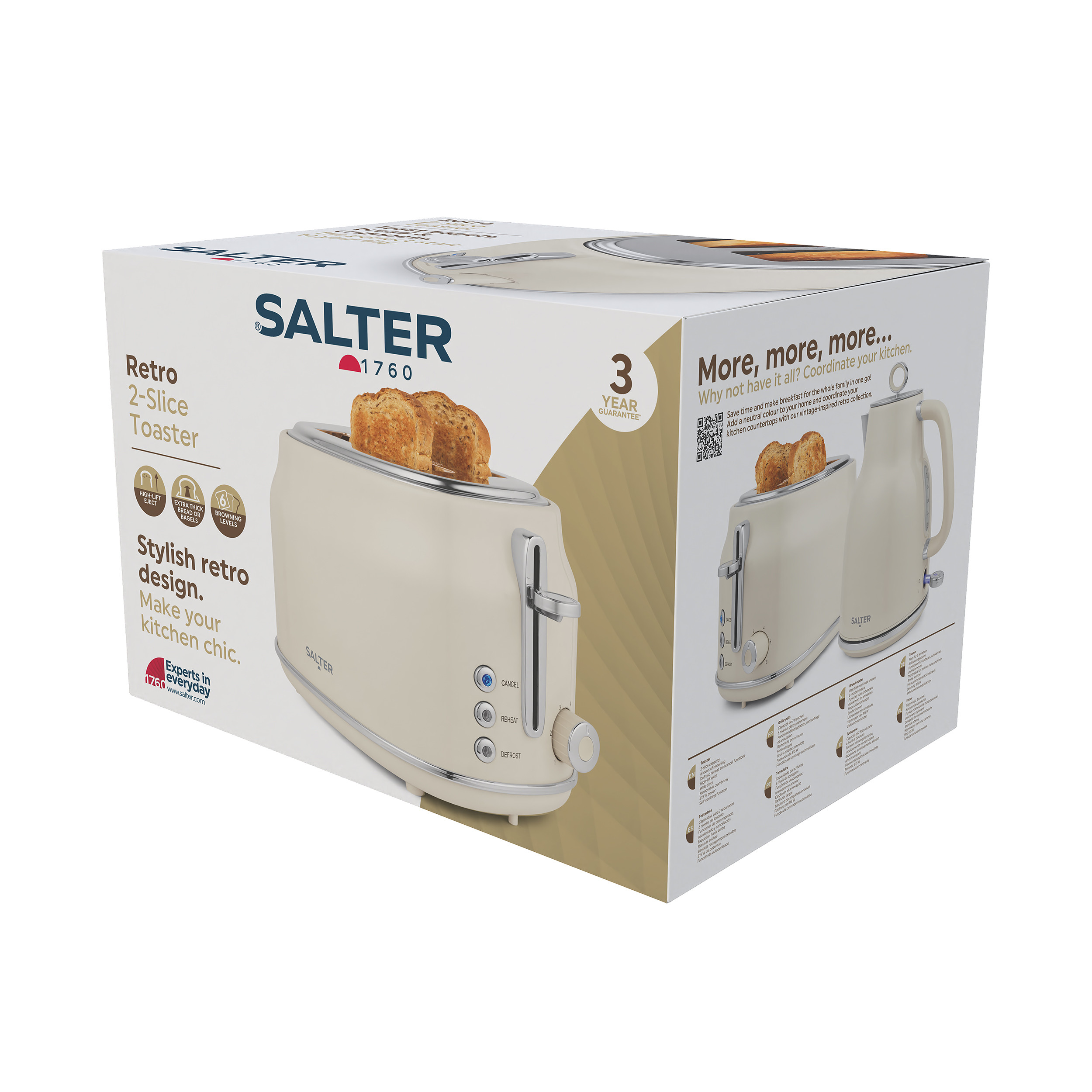 Toast bread, bagels and crumpets to start your day! Our Salter Retro Cream toaster has wide slots to fit all your favourite bread. The 2-slice toaster has 6 browning levels to choose your desired toast, with defrost, reheat and cancel for extra convenience on busy mornings! The high lift eject and self-centring functions ensures even toasting and a removable crumb tray helps for easy cleaning. The chic, classic cream design looks great in all kitchen settings with coordinating items available.