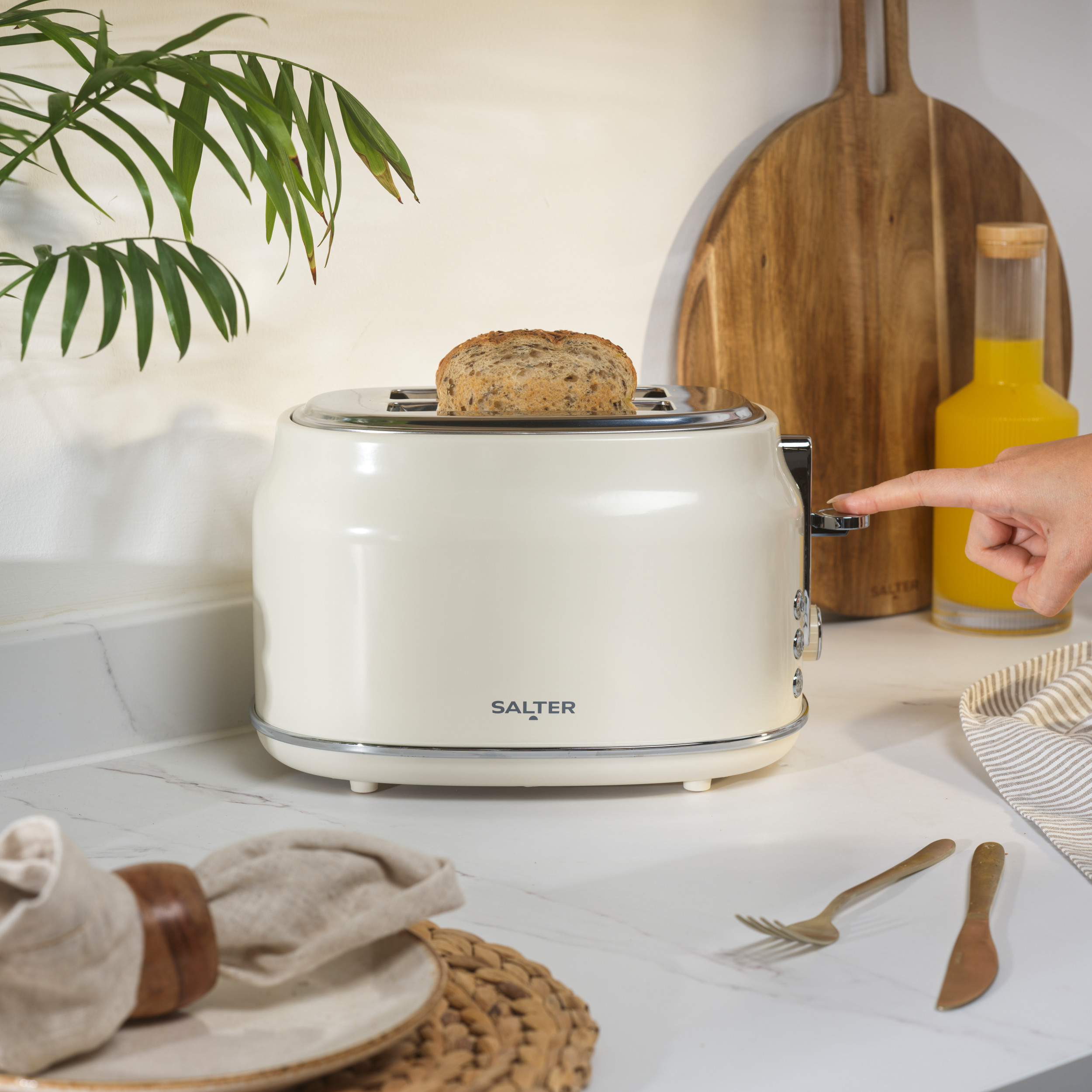 2-SLICE TOASTER: Toast bagels, bread and crumpets - the perfect start to your day, with the wide slot 2-slice Salter Retro Toaster in cream.