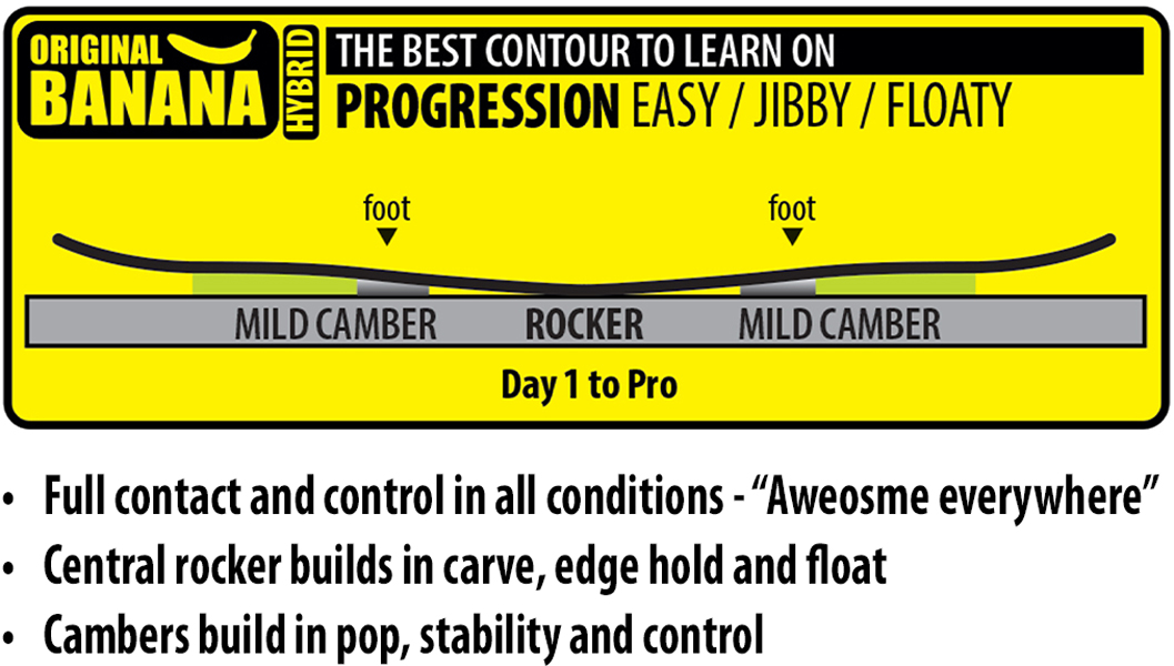 Die revolutionäre, preisgekrönte "Banana Tech" Rocker/Camber Contour des Skate Bananas hat Snowboarden neu definiert. Einfach zu fahren, Spaß pur, höchste Performance – egal ob auf Hardpack, beim Jibben oder im Powder.