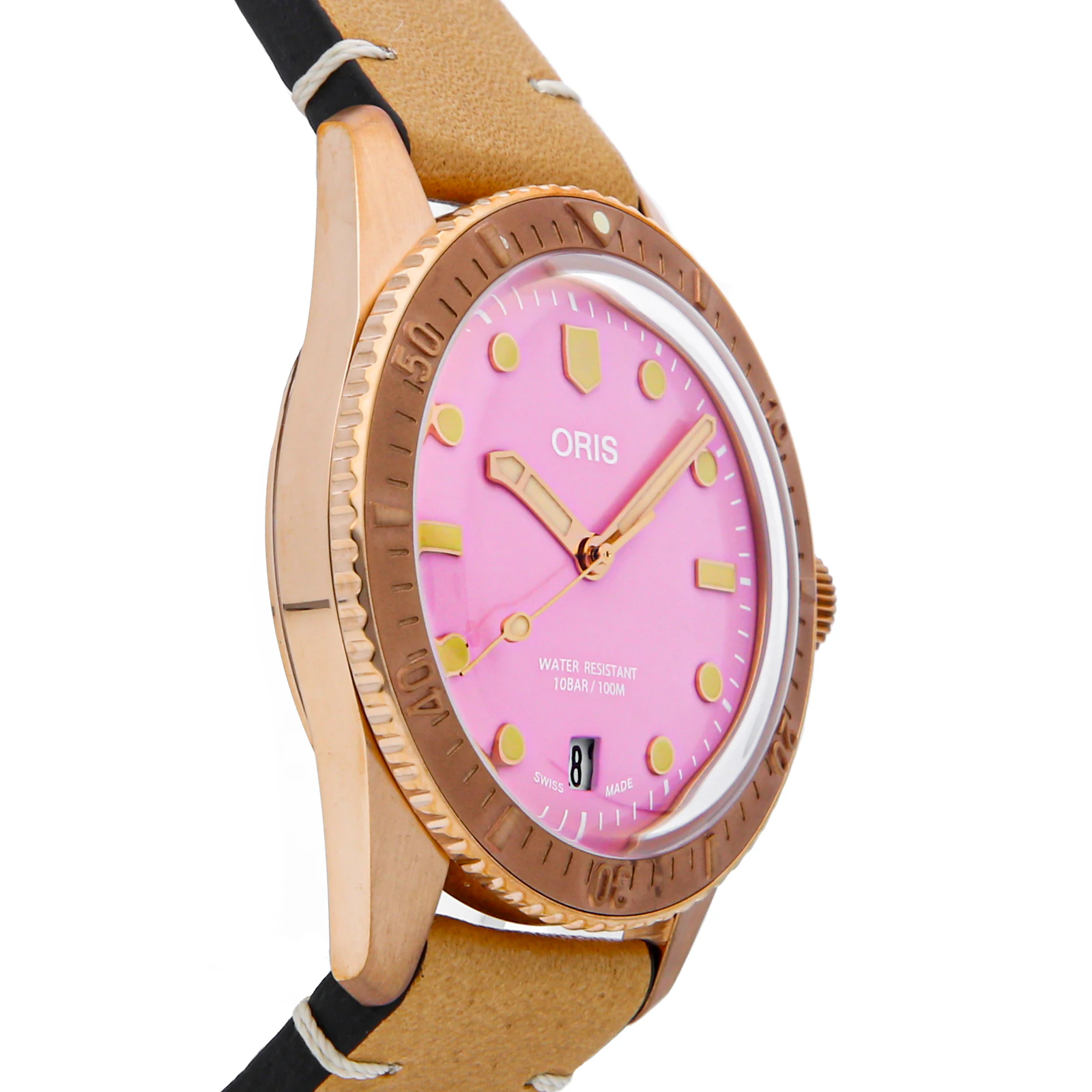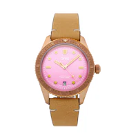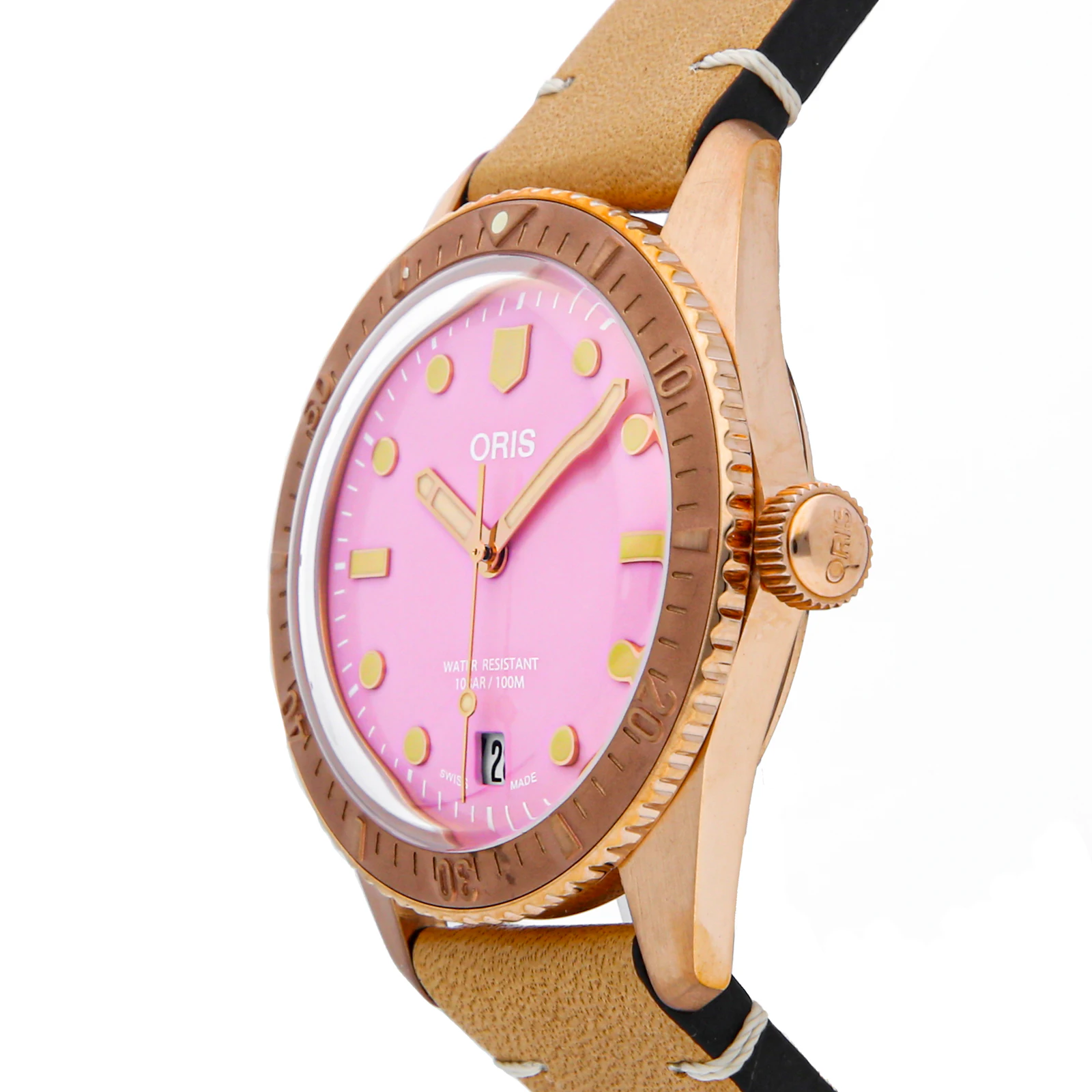 Pre-Owned Oris Divers Sixty-Five 'Cotton Candy' (01733777131580751904BR) self - winding automatic watch, features a 38mm bronze case surrounding a lipstick pink dial on a tan leather strap complete with a bronze tang buckle. Functions include hours, minutes, seconds and date. This watch comes complete with the original box and papers. Majority of time remaining on the factory warranty!