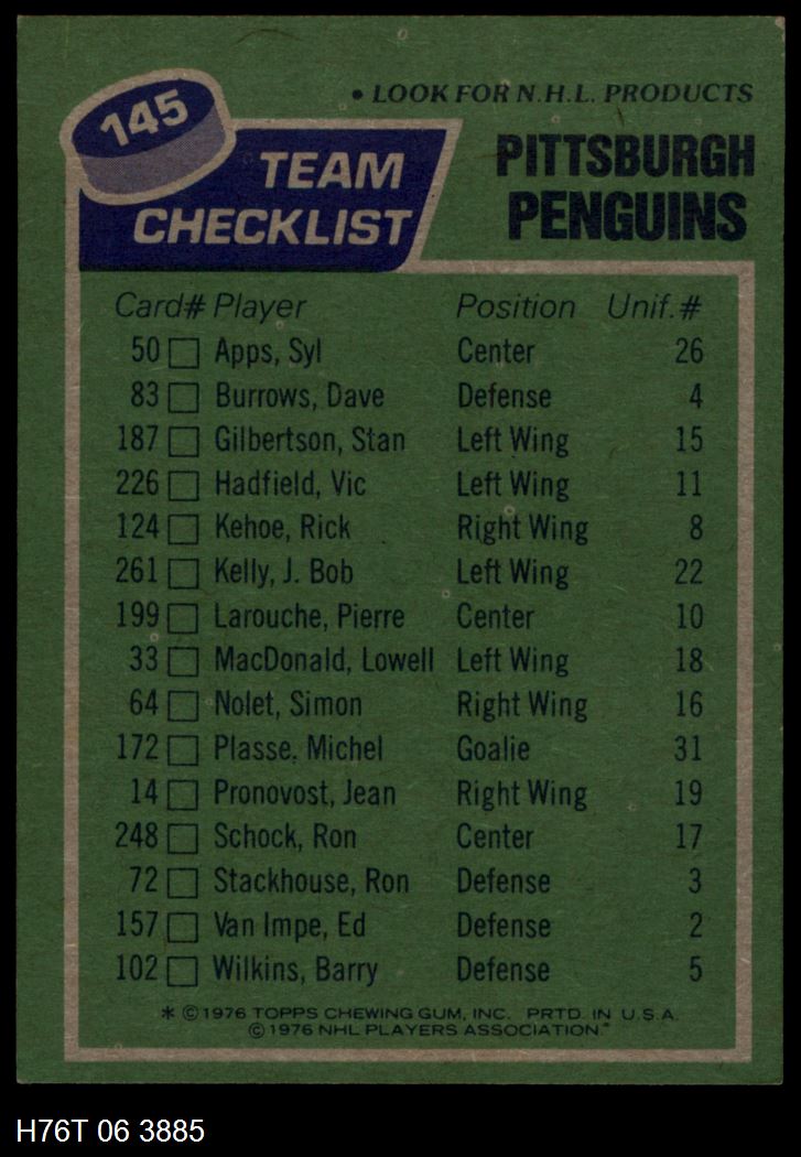 This 1976-77 Topps Pittsburgh Penguins Near Team Set contains the majority of the Pittsburgh Penguins cards and makes the perfect gift for the Pittsburgh Penguins fan. ?With an inventory of over 20,000 team sets, Dean's Cards has Team Sets & Near Team Sets in multiple conditions.