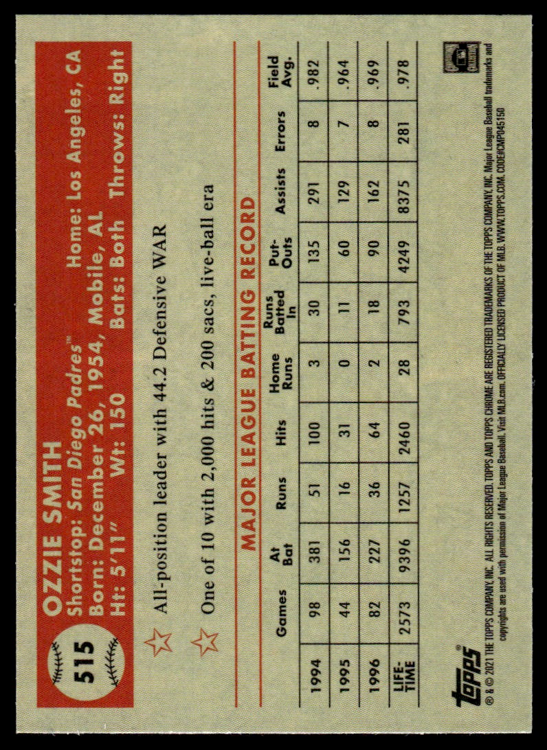 | 2021 Topps Chrome Platinum Anniversary Ozzie Smith San Diego Padres #515 | ||||||||||||||||