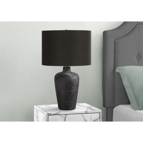 • Designed in a vase shape, this textured black ceramic table lamp, topped with a black fabric shade and finished with a round black finial on top, will bring sophisticated style to any living room, bedroom, or office space.