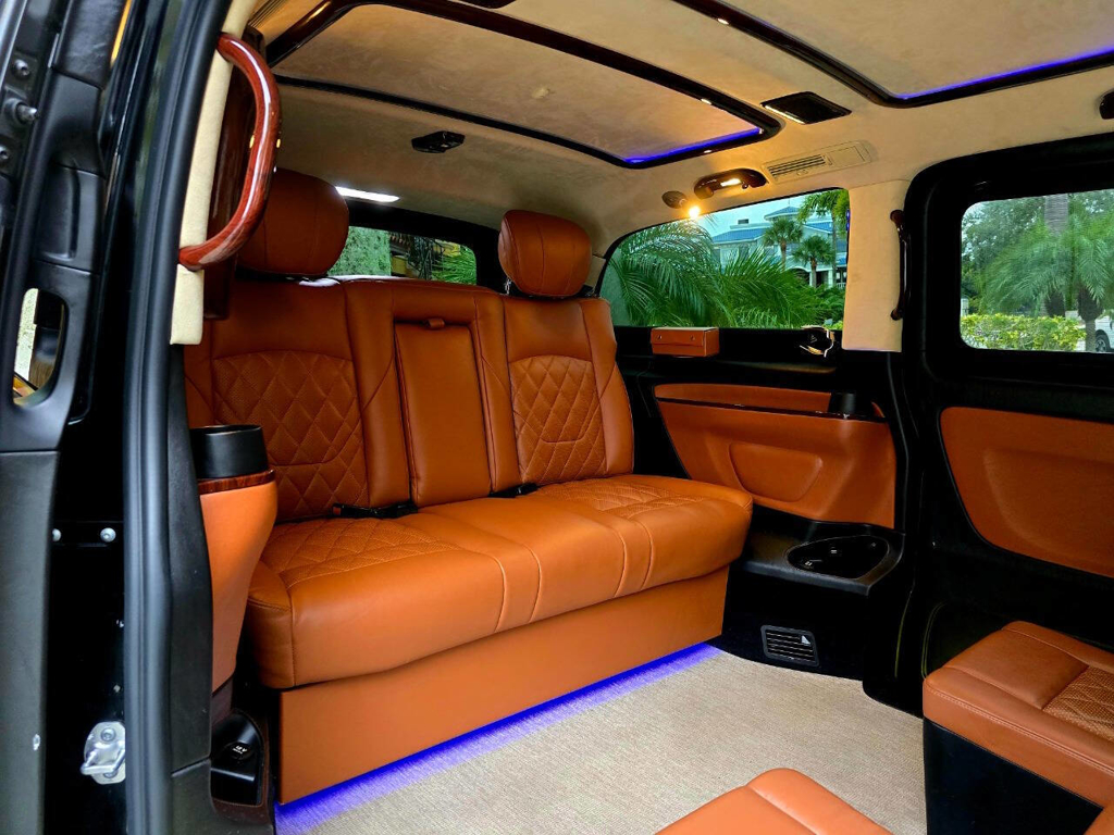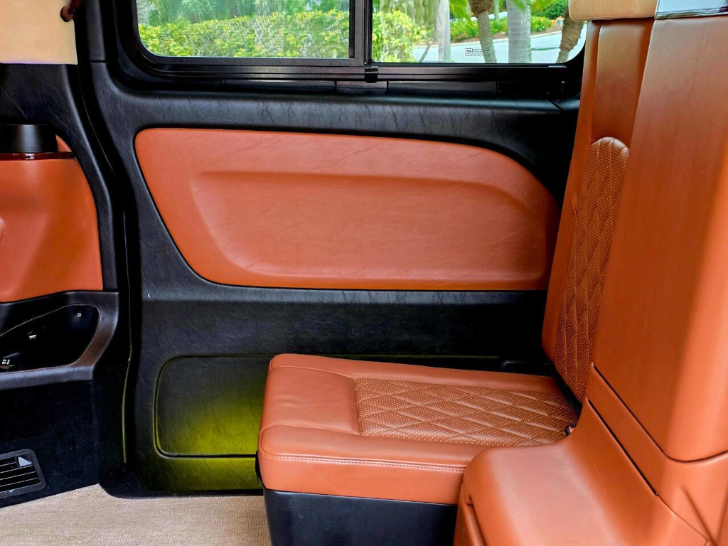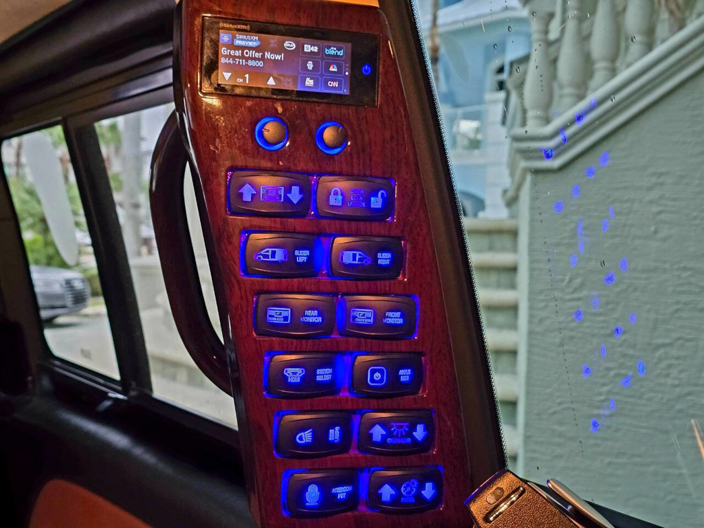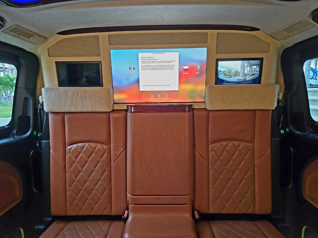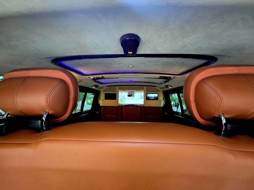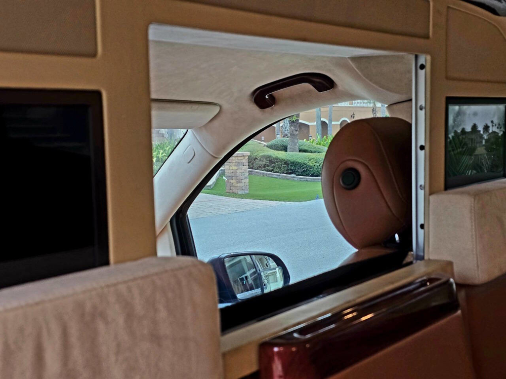 Open the doors and the first impression is unmistakably upscale. The exterior wears Maybach-style upgrades, including champagne-flute-style wheels wrapped in brand-new tires, projecting a commanding, bespoke presence before you even step inside. In the cabin, you’ll find a custom partition finished with a full-width flatscreen TV equipped with Apple TV, transforming the rear into a private entertainment suite. The rear seats ahead of the partition can slide forward and angle inward for extra space when needed, while power sliding doors on both sides provide effortless access. Rear passengers enjoy dedicated climate controls and a bank of command buttons that handle nearly every in-cabin function. Communication is seamless thanks to an integrated intercom system that allows easy conversation with the driver, while security cameras give rear passengers complete situational awareness. Enhancing the cabin atmosphere is elegant ambient lighting that softly illuminates the interior, creating a refined, lounge-like environment for evening travel. Entertainment continues with SiriusXM Radio and integrated media controls.