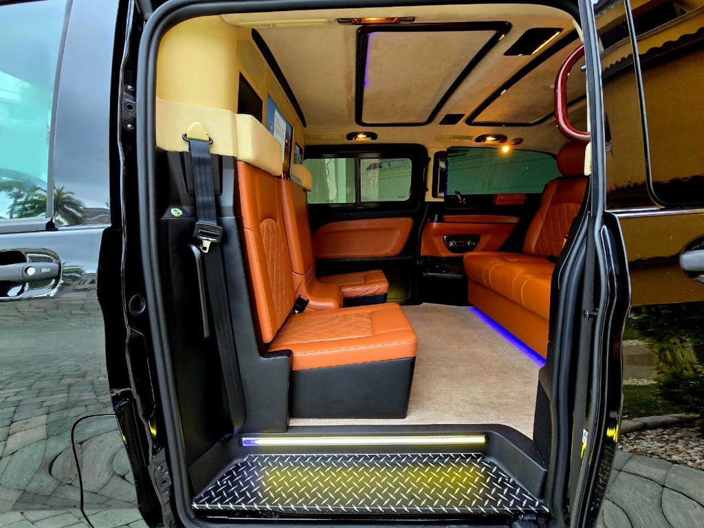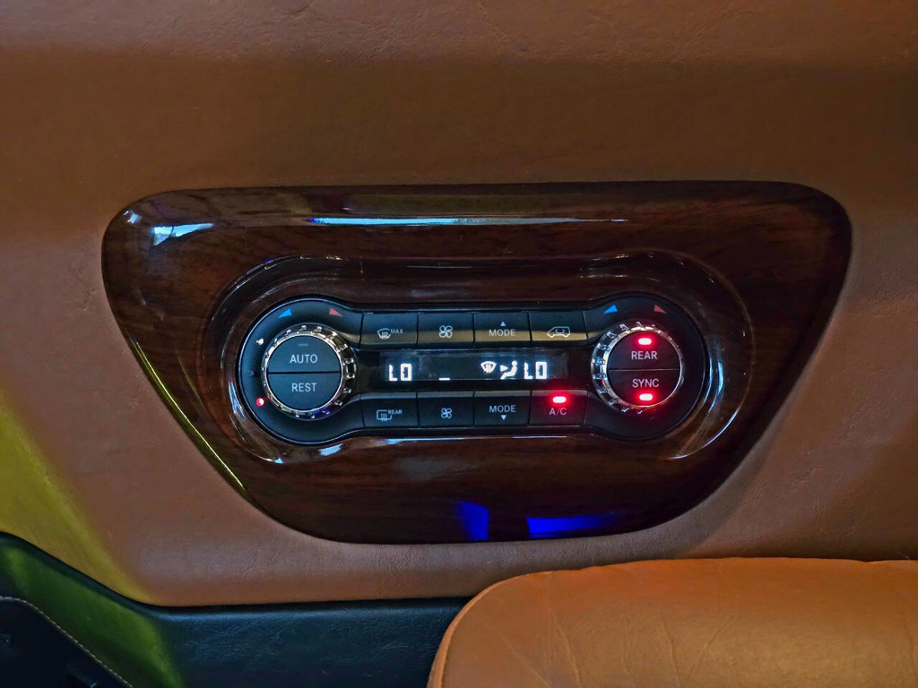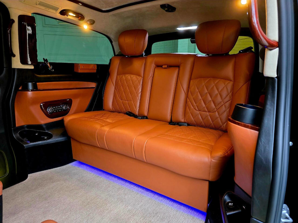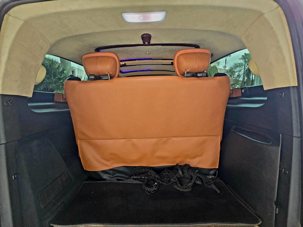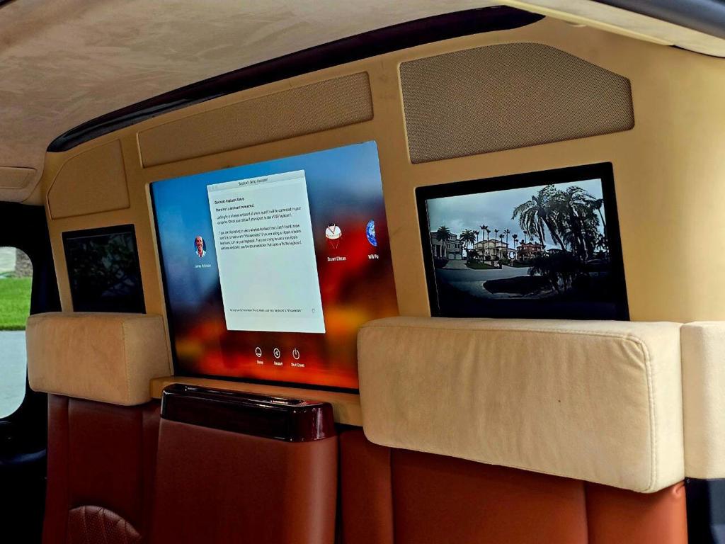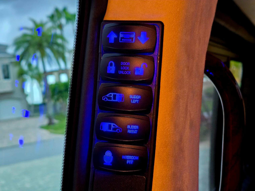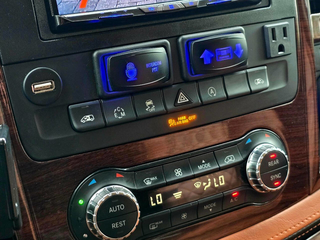 Open the doors and the first impression is unmistakably upscale. The exterior wears Maybach-style upgrades, including champagne-flute-style wheels wrapped in brand-new tires, projecting a commanding, bespoke presence before you even step inside. In the cabin, you’ll find a custom partition finished with a full-width flatscreen TV equipped with Apple TV, transforming the rear into a private entertainment suite. The rear seats ahead of the partition can slide forward and angle inward for extra space when needed, while power sliding doors on both sides provide effortless access. Rear passengers enjoy dedicated climate controls and a bank of command buttons that handle nearly every in-cabin function. Communication is seamless thanks to an integrated intercom system that allows easy conversation with the driver, while security cameras give rear passengers complete situational awareness. Enhancing the cabin atmosphere is elegant ambient lighting that softly illuminates the interior, creating a refined, lounge-like environment for evening travel. Entertainment continues with SiriusXM Radio and integrated media controls.