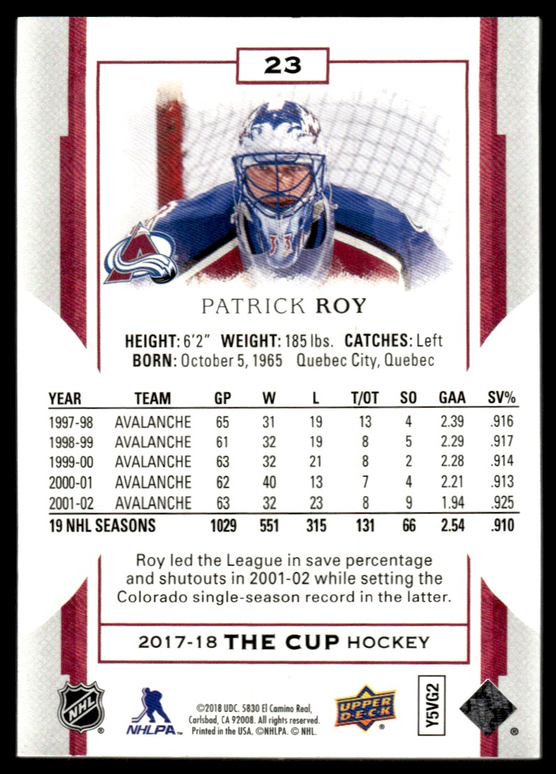 | 2017-18 Upper Deck The Cup Patrick Roy 012/249 Colorado Avalanche #23 | ||||||||||||||||||