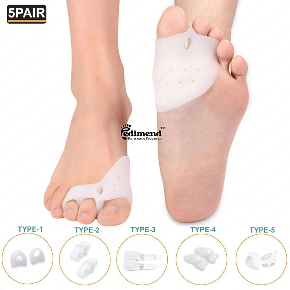 Product FeaturesABOUT GEL BUNTION TOE SPACER Gel Toe Protector and Toe Spacer by Pedimend™ is an innovative product that is designed to put an end to a bunion, toe overlap, and hammer toe pain. Made of premium quality medical grade gel, these bunion toe correctors provides comfortable spacing in between toes to realign toes and thereby prevent bunion formation. The bunion relief bunion toe straightener also features a gel bunion pad that cushions the sensitive bunion area, providing relief from painful rubbing and friction against shoes. These gel bunion splints can be worn beneath socks and in shoes during any activity. They will not move around or slide and will offer maximum comfort for those suffering from a bunion, toe, or foot pain. The toe protectors are unisex and stretchable to fit all-size feet. KEEP TOE IN CORRECT POSITION Pedimend™ Bunion Toe Separator designed for better separation and alignment of overlapping toes. Moreover, toe separator is also designed to keep big toe in the correct position. It prevents the big toe moving inwards, towards the other toes, while the big toe joint is forced outwards. It helps you ease pressure on the bunion, straighten and realign toes, and prevents toes from overlapping. BUNION PROTECTION One of the main purposes is to protect bunions, which are painful, bony protrusions that often develop at the base of the big toe. The silicone gel protector forms a cushion around the bunion, reducing friction and pressure against shoes, thus alleviating pain and preventing further irritation. WITH FOREFOOT PAD CUSHION They can greatly reduce the fatigue at the bottom of the feet. Provides you enhanced bunion coverage, protection, easing of discomfort and pressure. The side flap keeps shoes from rubbing along the sensitive skin of the bunion. GEL BUNION PROTECTOR FEATURES ☞ Flexible silicone gel material for comfort and durability. ☞ Suitable for all-day wear. ☞ Secure double-loop design prevents slipping. ☞ Easy to wash and maintain. ☞ Premium quality bunion corrector for cost-effective relief. SILICONE GEL TOE SEPARATOR FUNCTIONS ☞ Alleviates Toe Discomfort caused by Crowded toes ☞ Helps reduce cramps, aches, and pains in the toes ☞ Prevents rubbing, foot corns, and blisters ☞ Provides effective bunion relief ☞ Reduces the risk of calluses and foot corns ☞ Keeps the big toe from drifting towards the second toe. HOW DO I TAKE CARE OF THEM? Apply to clean and dry foot. For long life always clean with slightly warm water and after drying use a little bit of talcum powder. Ensure perspiration is regularly cleaned off the support and feet to ensure comfort and longevity of the item; with regular breaks taken. PACKAGE INCLUDED ☞ Toe Separator and Bunion Corrector WHY PURCHASE FROM PEDIMEND™? Why purchase from PEDIMEND™, When others Look the same , FOR LESS?