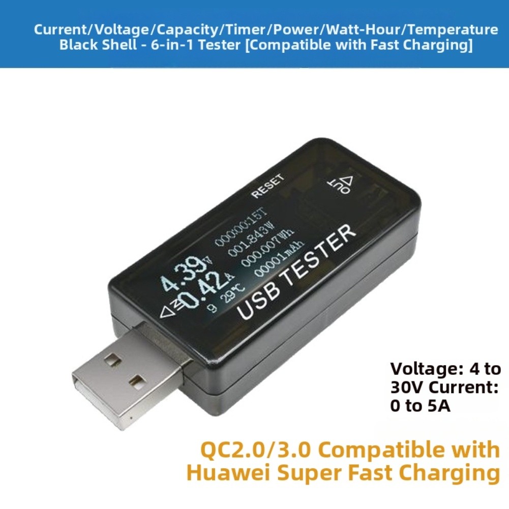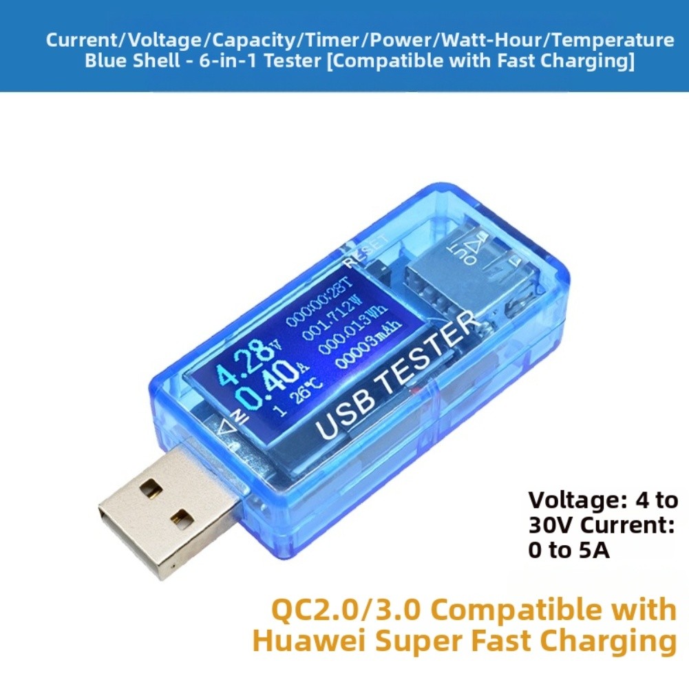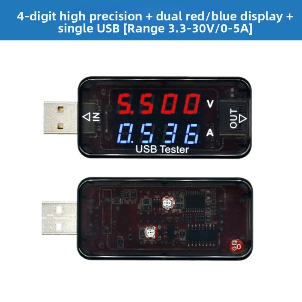 Power test range: 0.00 - 9.99 - 99.9 W, decimal point automatically moves. Overvoltage alarm: When voltage ≥ 5.6 V, the voltage decimal point flashes rapidly.