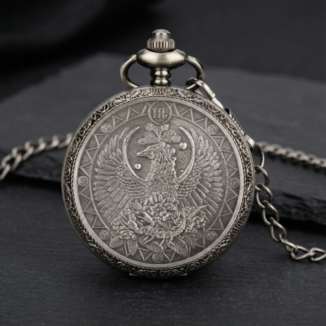 Popis produktu: Presented for acquisition is a striking pocket watch that masterfully blends a nostalgic aesthetic with modern precision. The robust, antique silver-tone case immediately captivates, featuring an extraordinarily detailed, high-relief engraving of a majestic phoenix-like creature, wings spread in powerful display, surrounded by an intricate wreath of blooming flora. The artistry evokes a rich sense of historical mythology and craftsmanship, further enhanced by esoteric symbols adorning the bezel. Upon opening the hinged cover, a pristine white dial is revealed, marked with crisp black Arabic numerals for hours 1 through 12, complemented by an inner ring indicating 13 through 24 for enhanced readability. The classic black hands ensure clear timekeeping. Discreetly noted on the dial, the reliable quartz movement guarantees accurate and maintenance-free operation, making this piece not only a visual marvel but also a dependable timekeeper suitable for daily wear or display. The reverse of the case is adorned with an equally elaborate and flowing pattern of foliage and scrollwork, demonstrating a continuous commitment to decorative detail across the entire watch. Accompanied by a matching antique-finish chain, this timepiece presents in excellent, seemingly unworn condition, ready to become a distinguished addition to any collection of unique accessories or as a thoughtful gift for enthusiasts of vintage-inspired design.