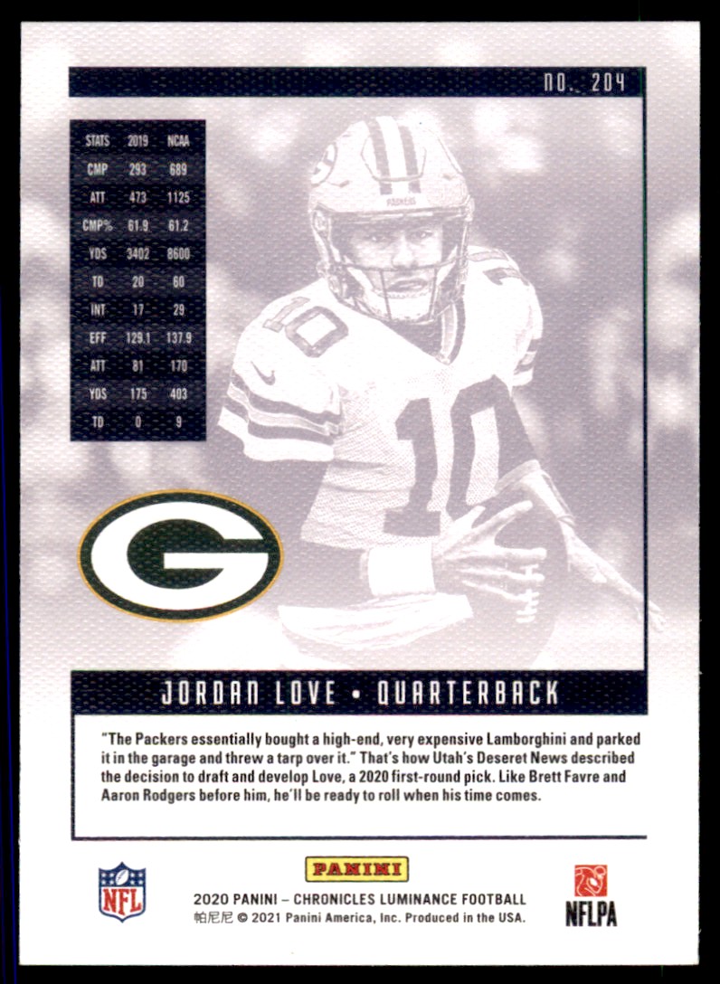 | 2020 Chronicles Luminance Jordan Love RC Green Bay Packers #204 |
