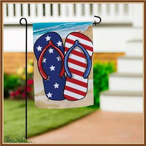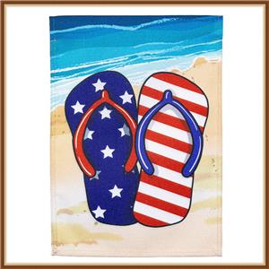 Welcome Friends & Family to your Home with this Flag called ✧ PATRIOTIC FLIP FLOP ✧ it features Red, White, and Blue Flip Flops on a on a Sandy and the Water Background, it is Perfect for Celebrating Independence Day, Memorial Day, Veteran's Day and More, and of Course for Everyday