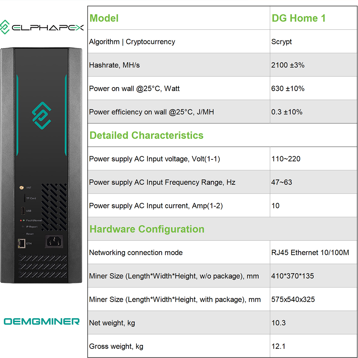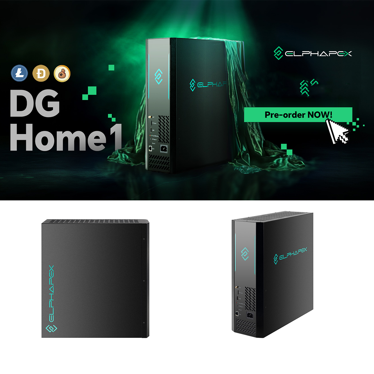 US STOCK – ElphaPex DG Home 1 LTC/DOGE Miner | 2.1 GH/s @ 630W Scrypt ASIC Miner for Litecoin & Dogecoin