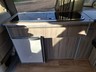 An essential side galley features a gas hob with two burners, a fridge with a freezer box, and a sink.