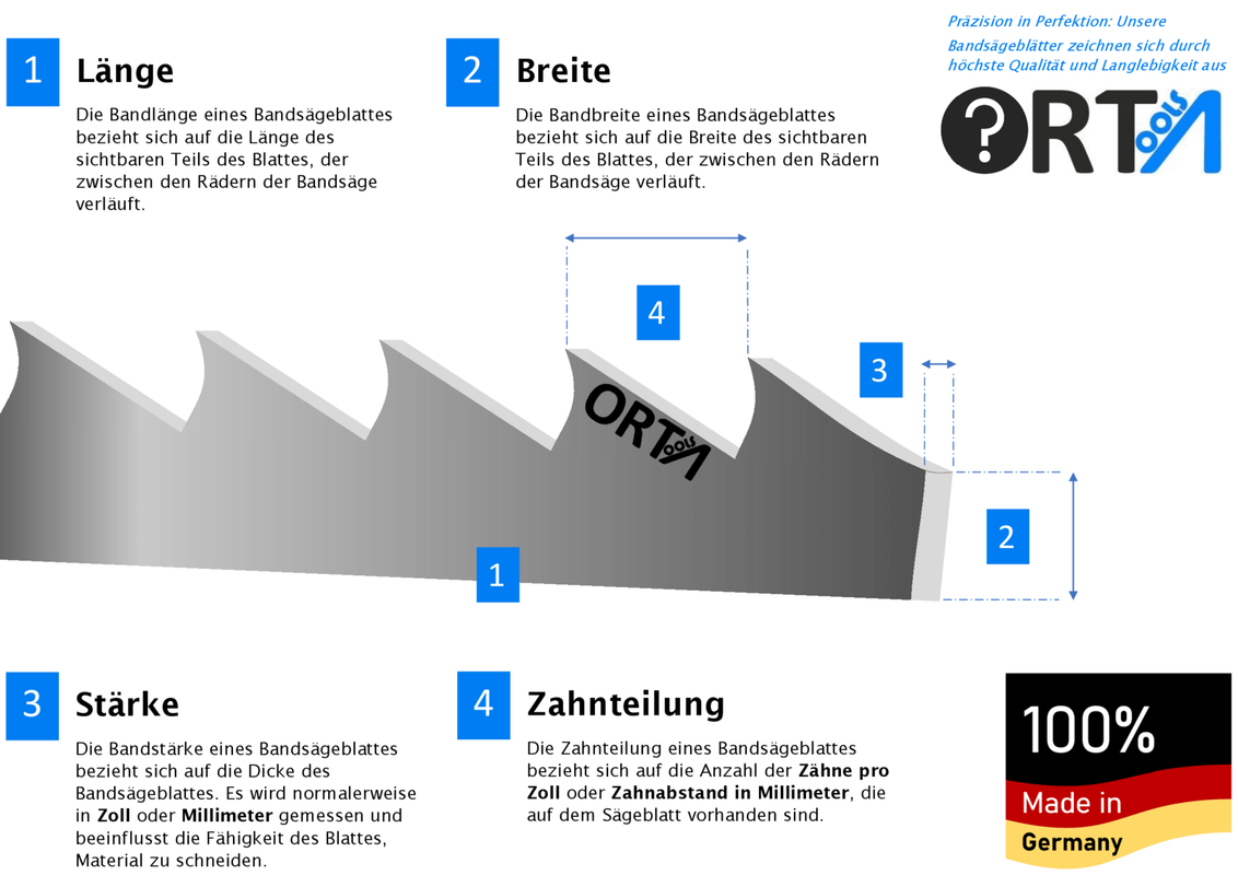 C'est la partie de la feuille qui coupe réellement du matériel. La longueur de la bande varie en fonction de la taille et du modèle de la scie à bande et peut normalement dans Douane ou millimètre être mesuré.