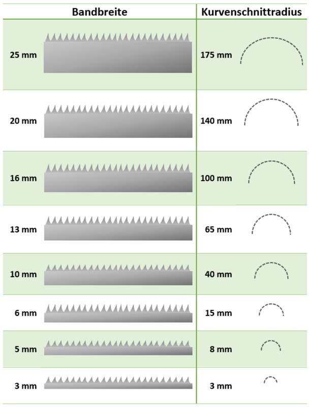 C'est la partie de la feuille qui coupe le matériau. La bande passante varie en fonction de la taille et du modèle de la scie à bande et peut normalement dans Douane ou millimètre être mesuré. Plus la feuille est large, plus la profondeur de coupe est grande et plus le matériau peut être coupé en même temps.