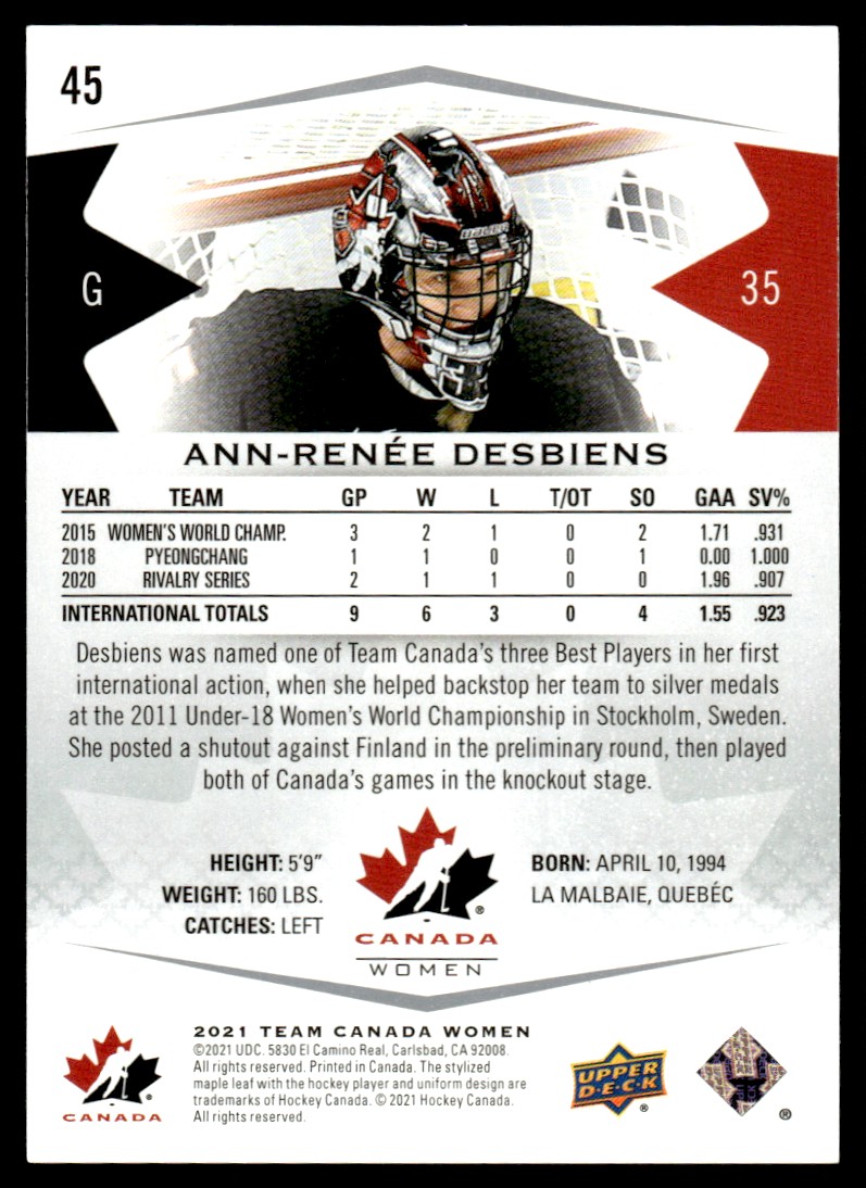 | 2021-22 UPPER DECK TEAM CANADA Ann-Renee Desbiens Canada #45 | ||||||||||||||||
