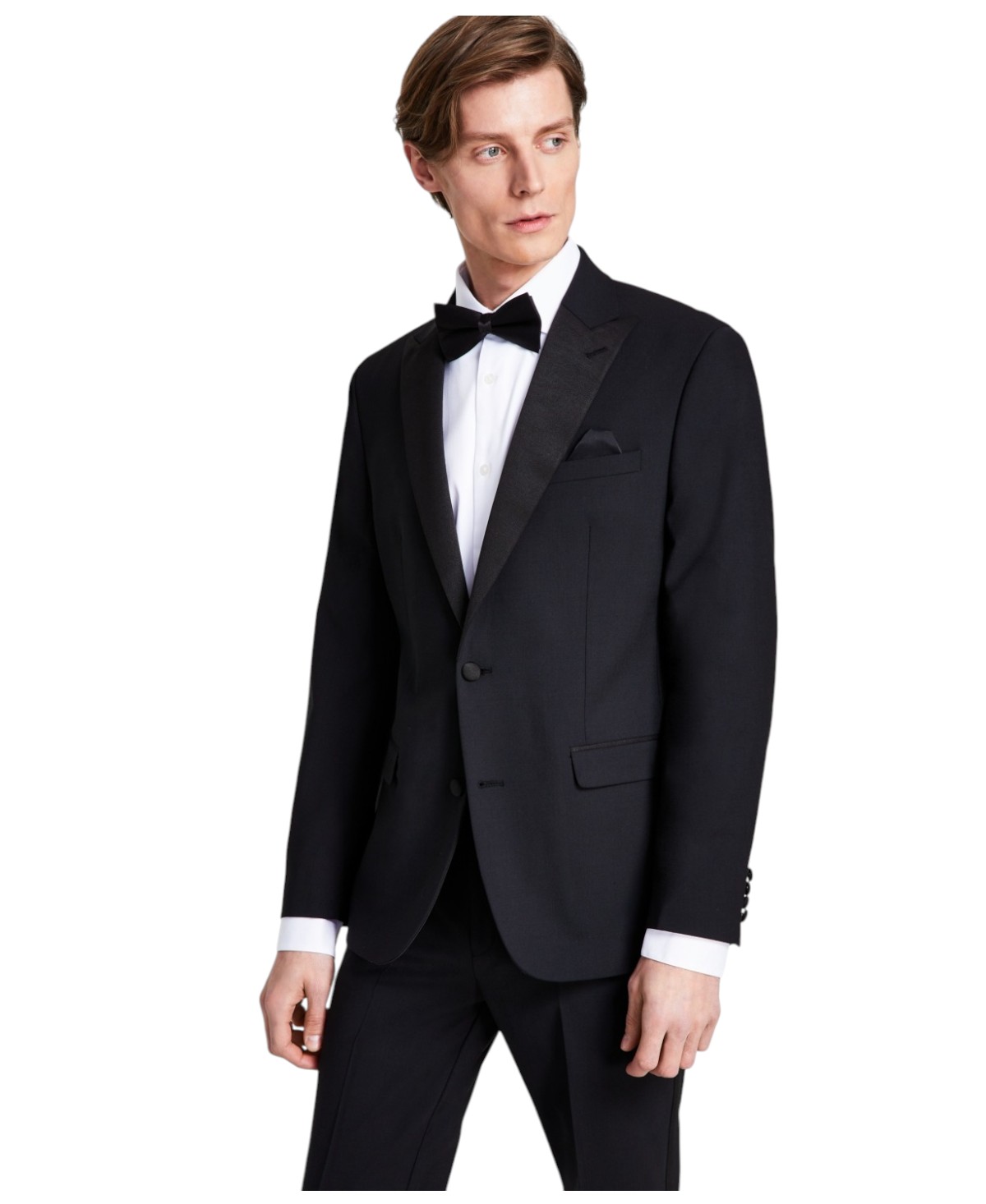 Bar Iii puts a subtle but sophisticated spin on a slim-fit tuxedo jacket with matching-color faille trim.