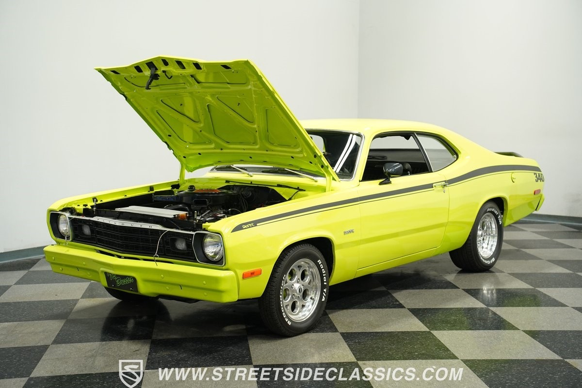 Experience the thrill and nostalgia of American muscle with this vibrant 1973 Plymouth Duster 340 Tribute. This car captures the essence of the early 70s with its bold color scheme and aggressive styling, offering a perfect blend of eye-catching aesthetics and raw power. It's more than just a car; it's a statement, a piece of history that turns heads and sparks conversations wherever it goes. Whether you're cruising the boulevard or showing at a classic car event, this Duster embodies a spirited lifestyle. Don't miss the chance to own this exciting 1973 Plymouth Duster 340 Tribute.