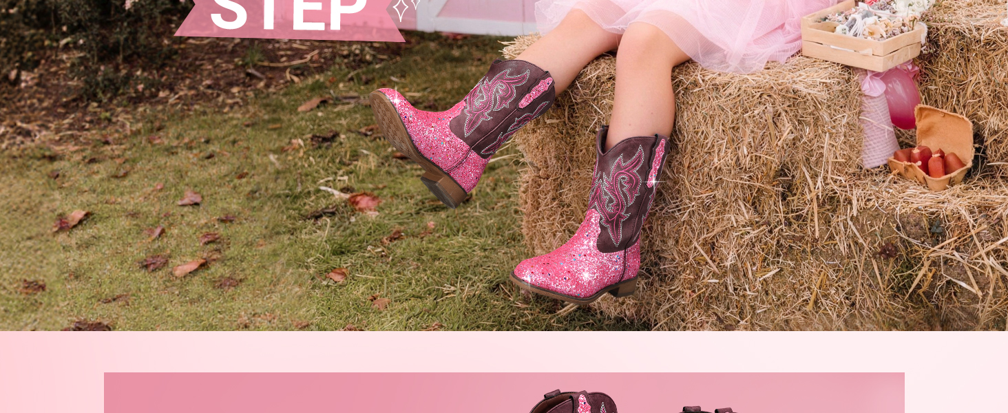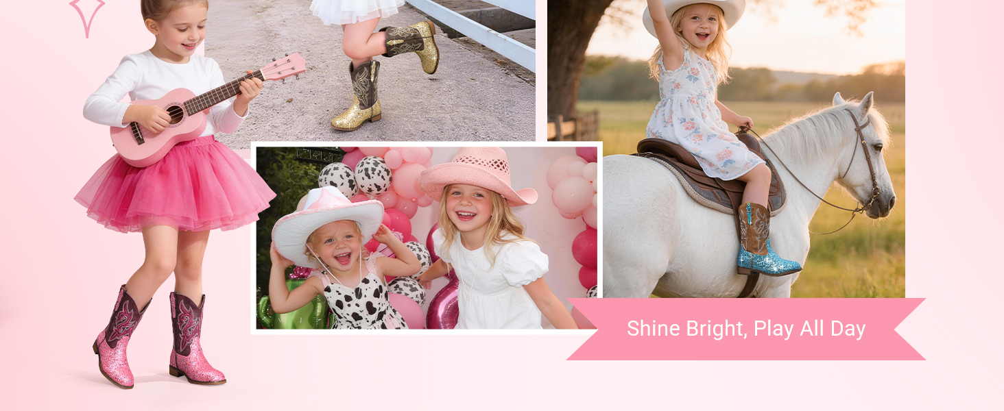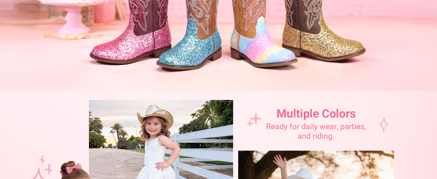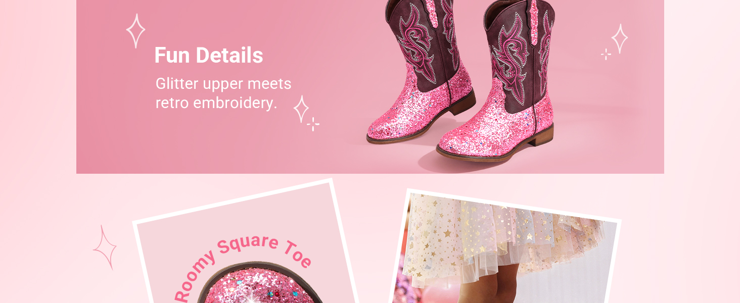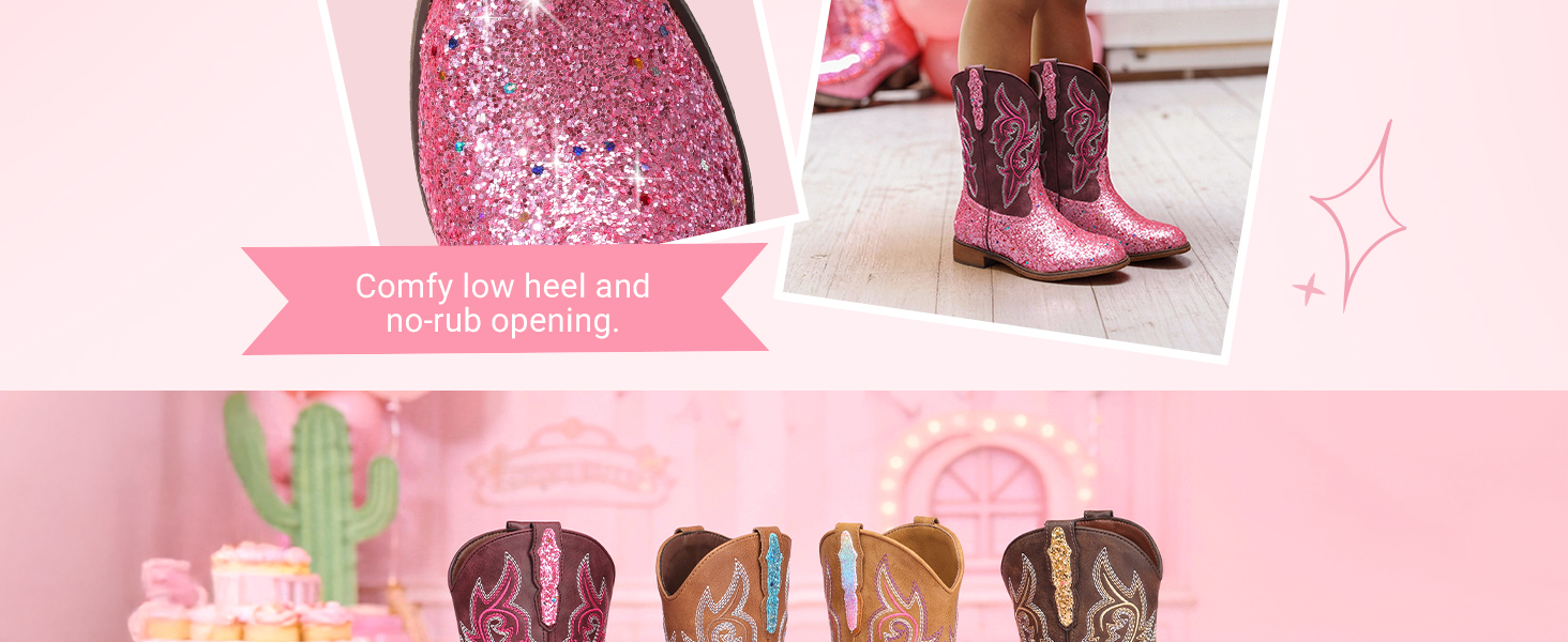 Sparkly Cowgirl Style: Glittery vamp, smooth PU shaft, and cute embroidery for standout Western charm.