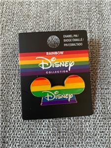 Faites briller vos couleurs ! Cette broche en émail doré présente un chapeau en forme de Mickey Mouse avec des rayures arc-en-ciel et un texte "Disney".