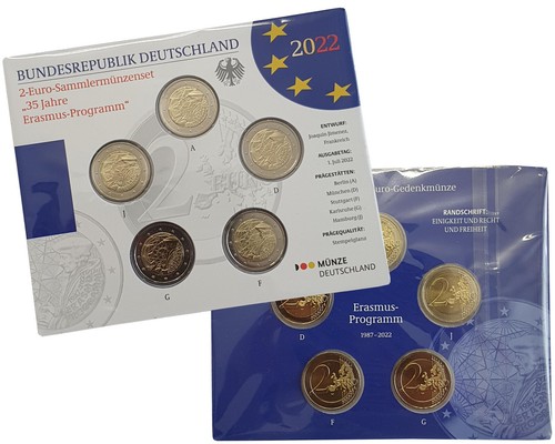 5 x 2 Euro Deutschland 2022 st Sammlermünzen- Set Stempelglanz Erasmus Programm